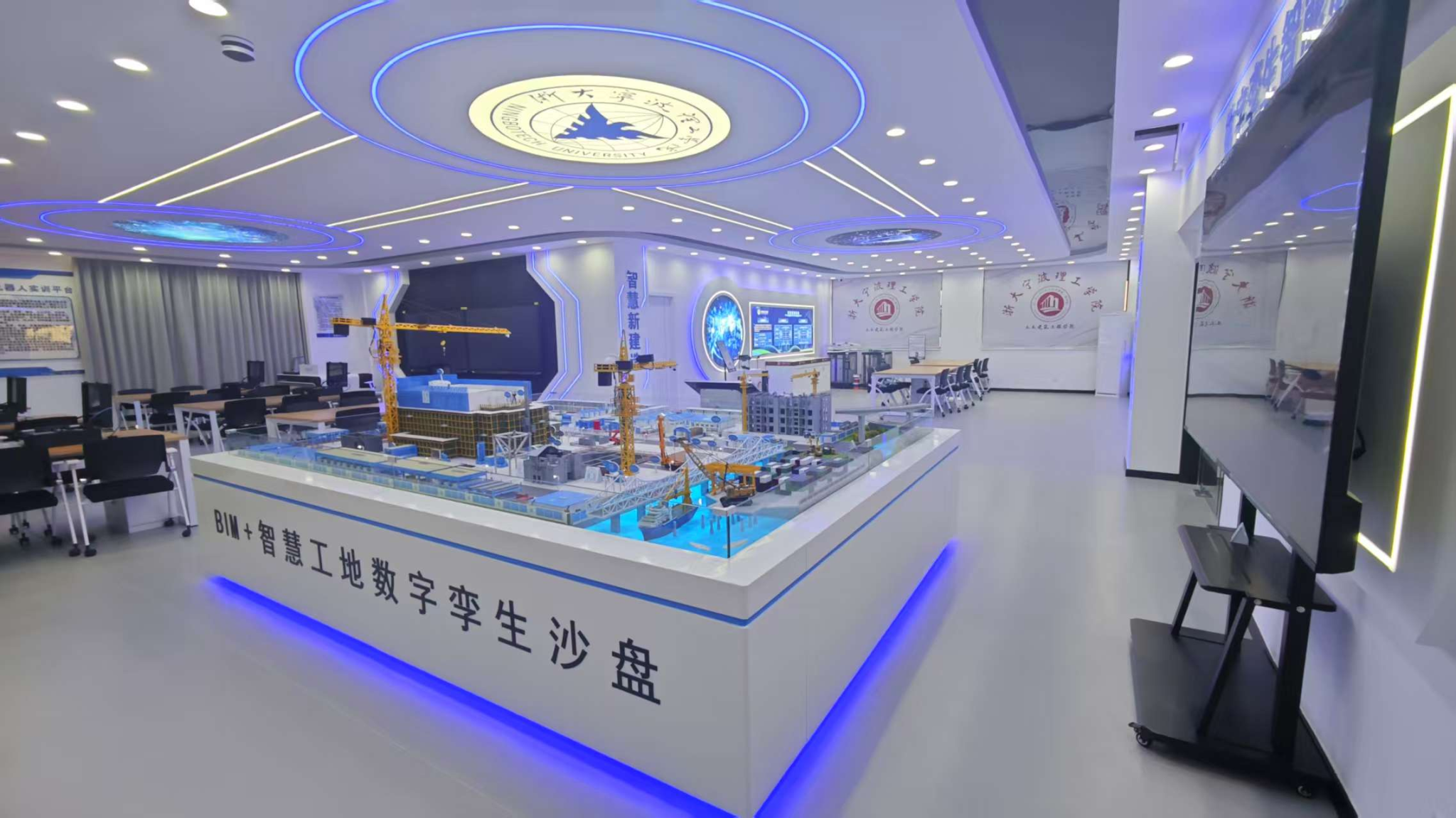 【图2:BIM+智慧工地数字孪生沙盘】(图说:实验室核心设备之一,可实时映射和模拟真实工地运行。)