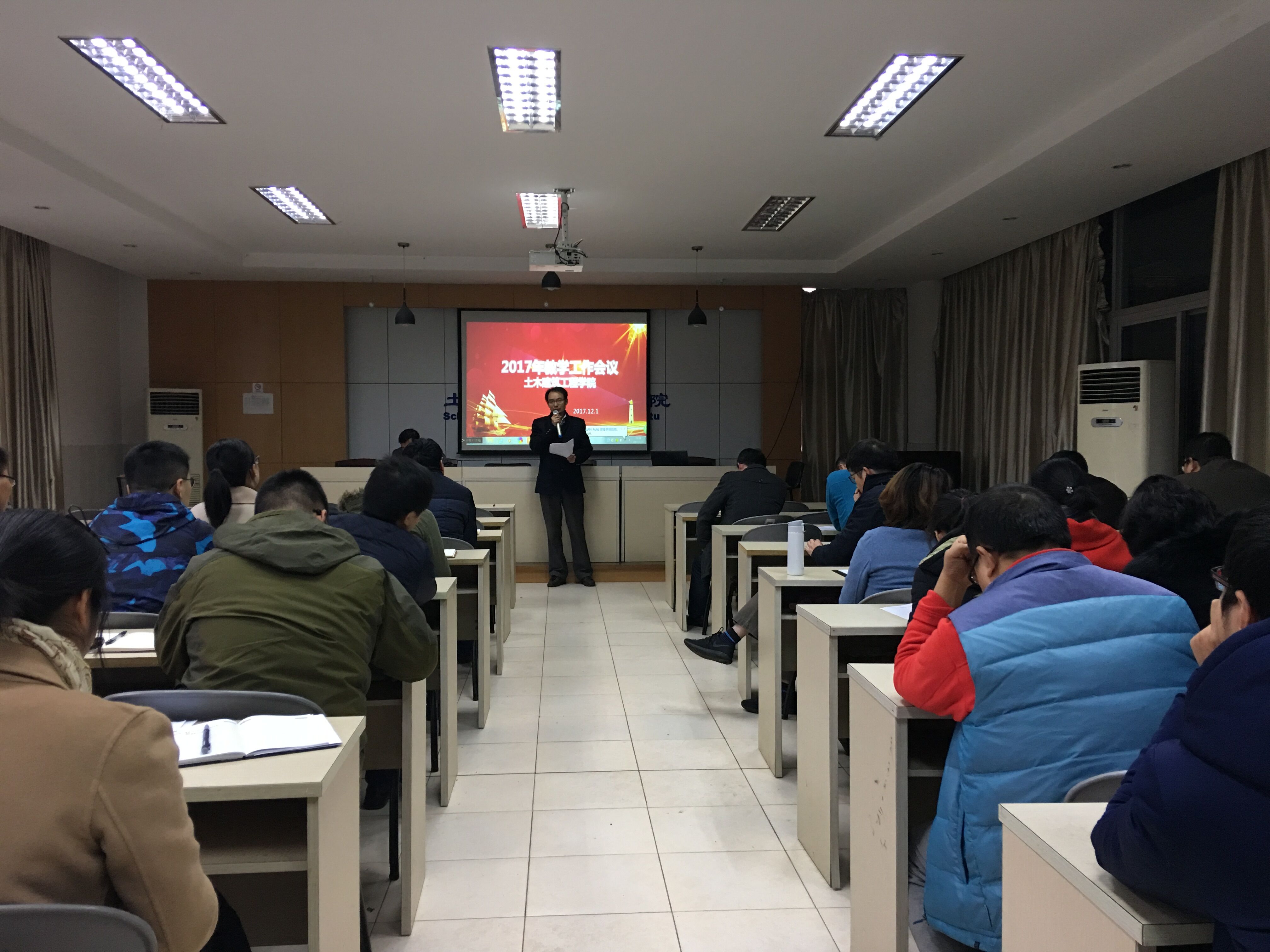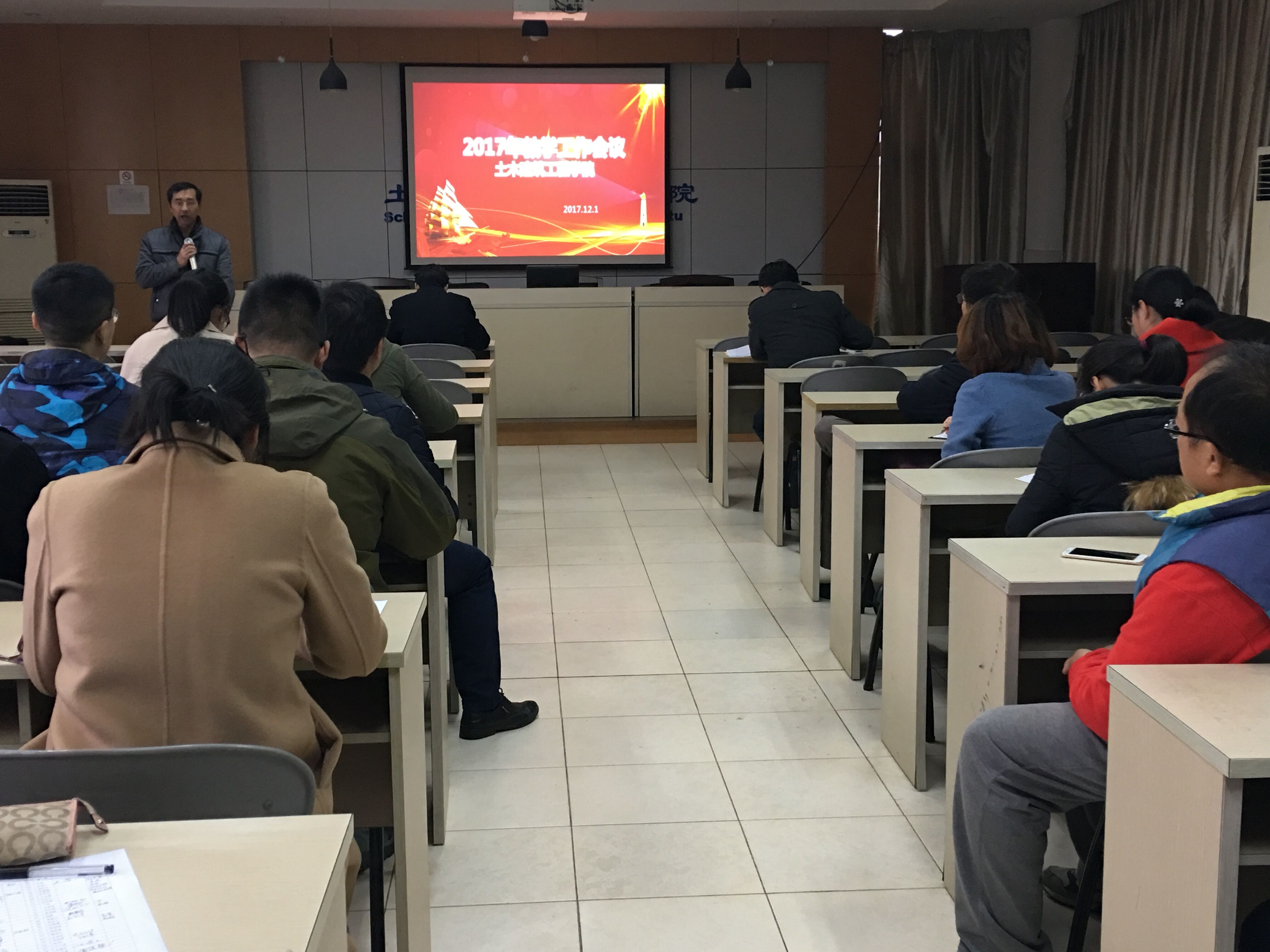 12月1日下午,土建学院在SA301召开2017年教学工作会议。学院领导和全体教职工参加了会议,会议由学院党总支书记童微星主持。