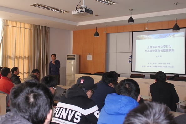 2016年1月14日下午,浙江大学建筑工程学院岩土工程研究所的凌道盛教授在SA301做了一场有关“土体多尺度灾变行为及其渐进演化的数值模拟”的学术报告会。 土建学院的部分老师、研究生和大四本科生共60多人参加了报告会。凌教授现为浙江大学建筑工程学院岩土工程研究所教授,软弱土与环境土工教育部重点实验室(浙江大学)副主任。主要从事土动力学与地震和交通荷载作用下交通基础设施灾变控制研究,主持了多项科技部和国家自然科学基金项目;已在国内外学术期刊发表学术论文170余篇;曾获国家科技进步二等奖和省部级科技进步一等奖。