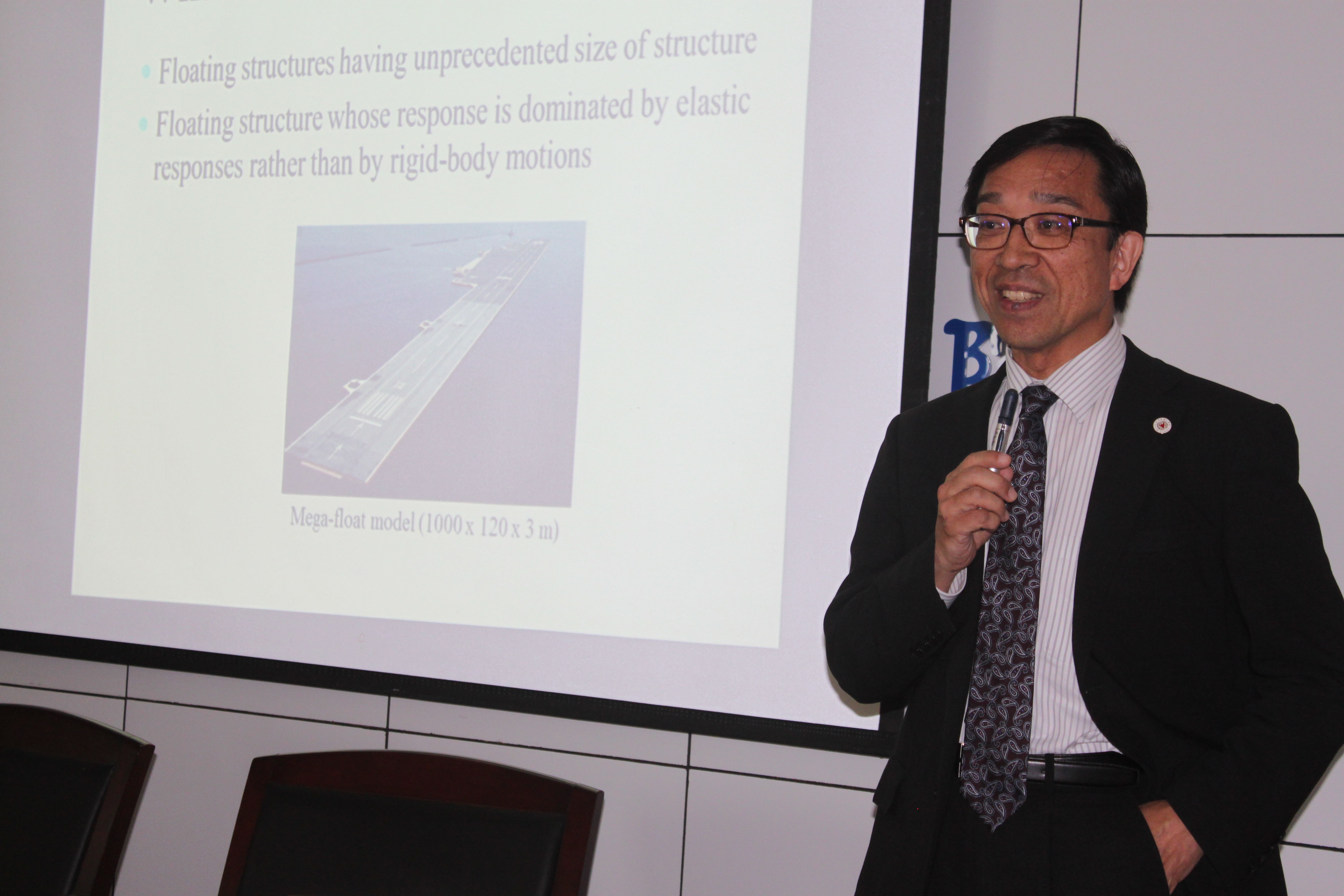 Masahiko Fujikubo教授为师生们做了题为《Very Large Floating Structures》的学术报告,报告重点讲述了超大型浮式结构物的发展历程和设计情况,阐述了设计、施工、安装以及维护的全过程,同时也探讨了大型浮式结构物可能面临的结构挑战和对环境影响。