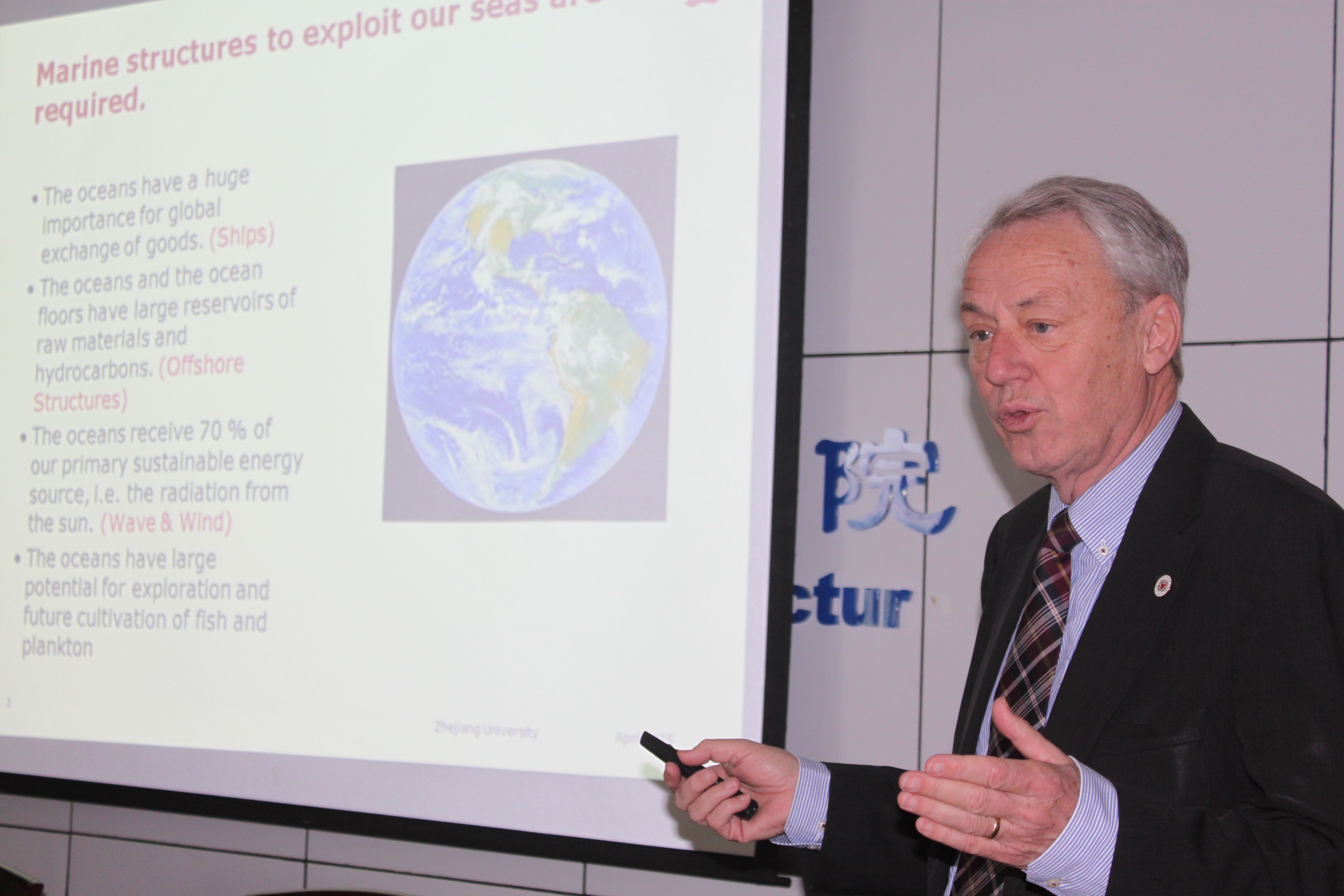 随后,Preben Terndrup Pedersen教授做了题为《Research on Ship Collision and the Role of University》的专题报告。报告围绕海工建筑物的发展和大学在海工技术上发挥的作用两个主题,通过生动形象的举例讲述了海工建筑物的作用以及现阶段面临的挑战,并阐述了可能会对环境产生的影响。Preben Terndrup Pedersen教授在报告中还提出了海工在船舶设计方面面临的诸多的挑战和需求,希望现在的大学生们保持积极开放的研究态度,积极参与国际会议和专业研讨,以后能有所建树。