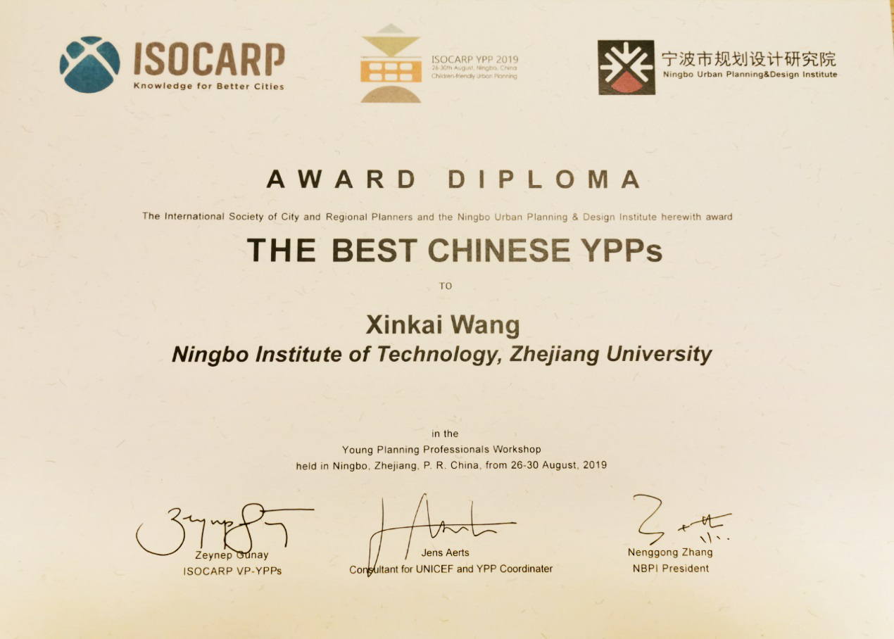 近日,由国际城市与区域规划师学会(ISOCARP)主办和联合国儿童基金会(UNICEF)主办,宁波市规划设计研究院(NBPI)承办的国际青年规划师工作坊在宁波正式启动。本次活动还得到了中国城市规划学会宁波工作站的指导。经过一周的角逐,经过主办方和承办单位的评选研究决定,授予我校浙江大学宁波理工学院土木建筑工程学院王欣凯博士“最佳中国青年规划师(The Best CHINESE YPPs)”称号。