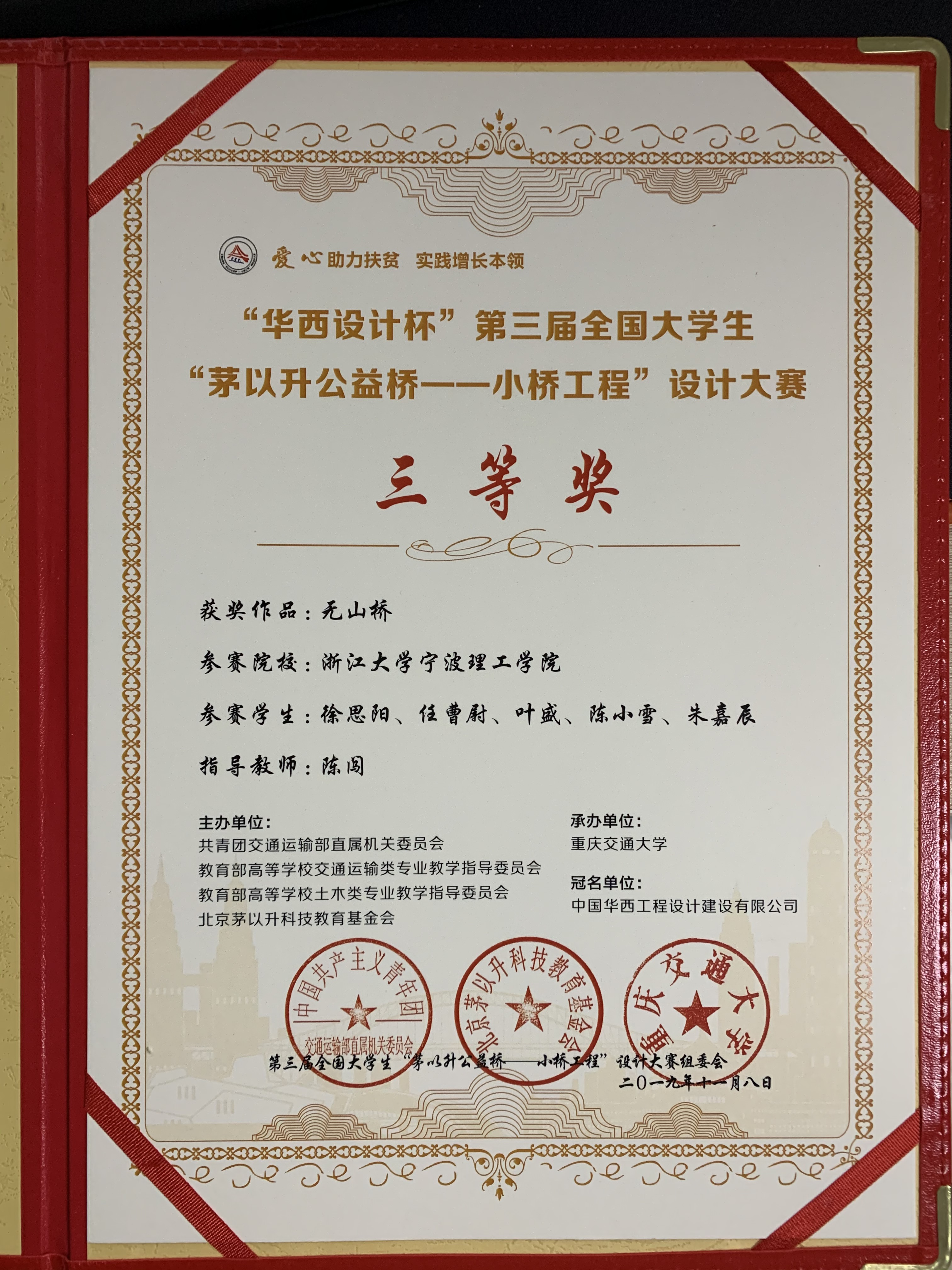 我院陈闯老师指导的由学生徐思阳、任曹尉、叶盛、陈小雪和朱嘉辰设计的作品“无山桥”,经过初赛阶段的专家评审和决赛阶段的沙盘展示、分组答辩等环节,最终获得“华西设计杯”第三届全国大学生“茅以升公益桥——小桥工程”设计大赛三等奖的好成绩。此次大赛系我院学生首次参加全国性的桥梁设计类竞赛,获得的成绩体现了我院结构与桥梁工程研究所在学生专业素质、动手和创新能力培养等方面取得的突破性进展。
