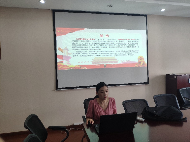 会上,学院党委副书记韩晶晶领学了“两会”主要内容和精神,对政府工作报告、通过《中华人民共和国民法典》、建立健全香港特别行政区维护国家安全的法律制度作了重点阐述。
