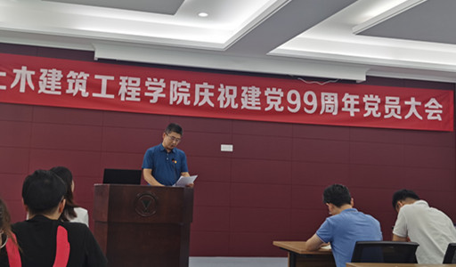2020年6月29日,在中国共产党建党99周年来临之际,土木建筑工程学院党委在SA305报告厅召开庆祝建党99周年党员大会。学院党委委员、学院纪委委员、全体党支部书记、教工党支部支委和全体学生党员到场出席,此次庆祝大会由学院党委副书记、纪委书记韩晶晶主持。
