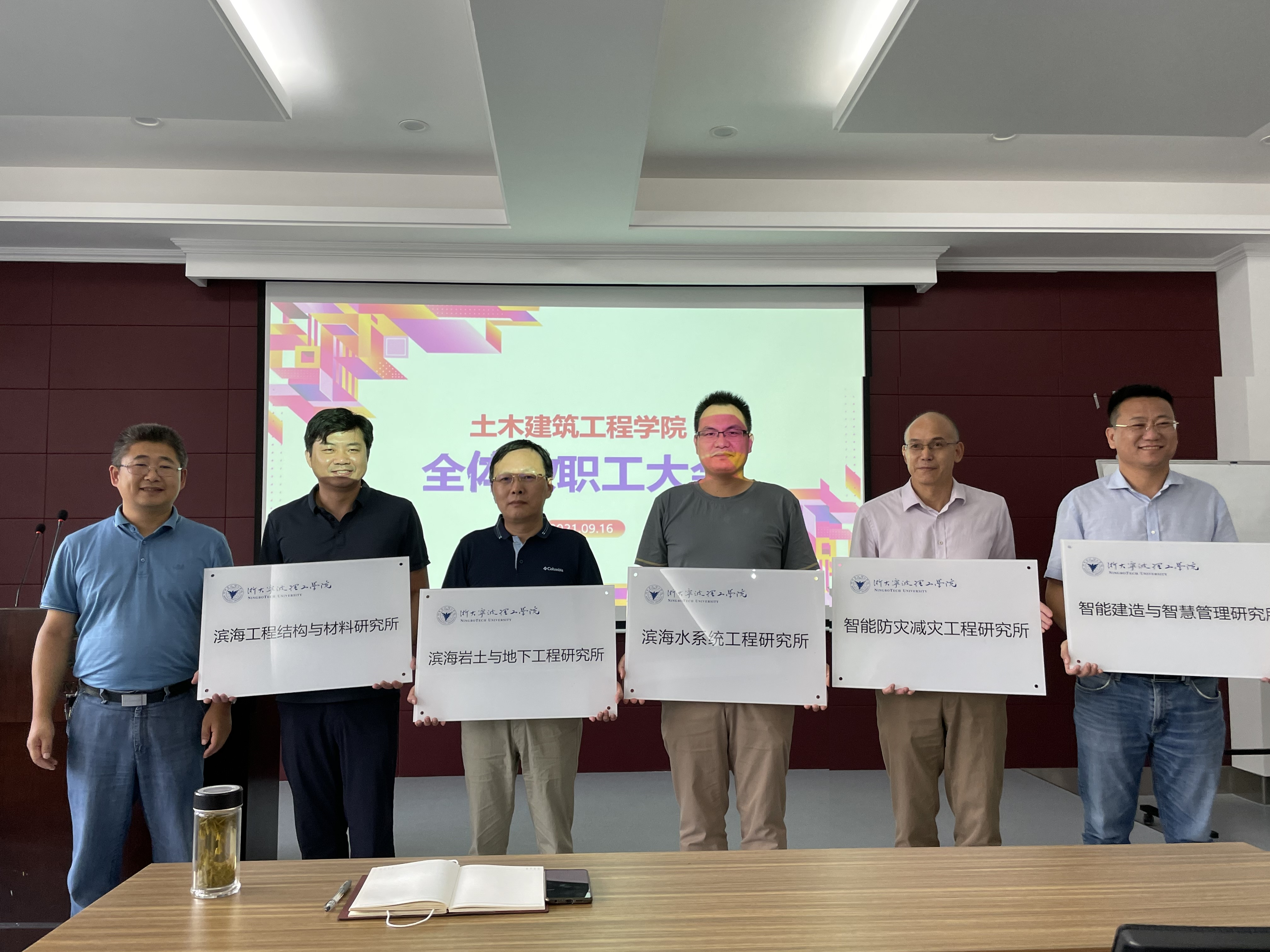 党委书记王银辉为新成立的滨海工程结构与材料研究所、滨海岩土与地下工程研究所、滨海水系统工程研究所、智能防灾减灾工程研究所、智能建造与智慧管理研究所等5个研究所授牌。王银辉书记对新任的5个研究所负责人表示祝贺,同时也提出更高的要求,希望各位负责人立足于学生培养的根本目标,抓住新机遇,开新局、创新绩,凝心聚力推动学院事业的发展。