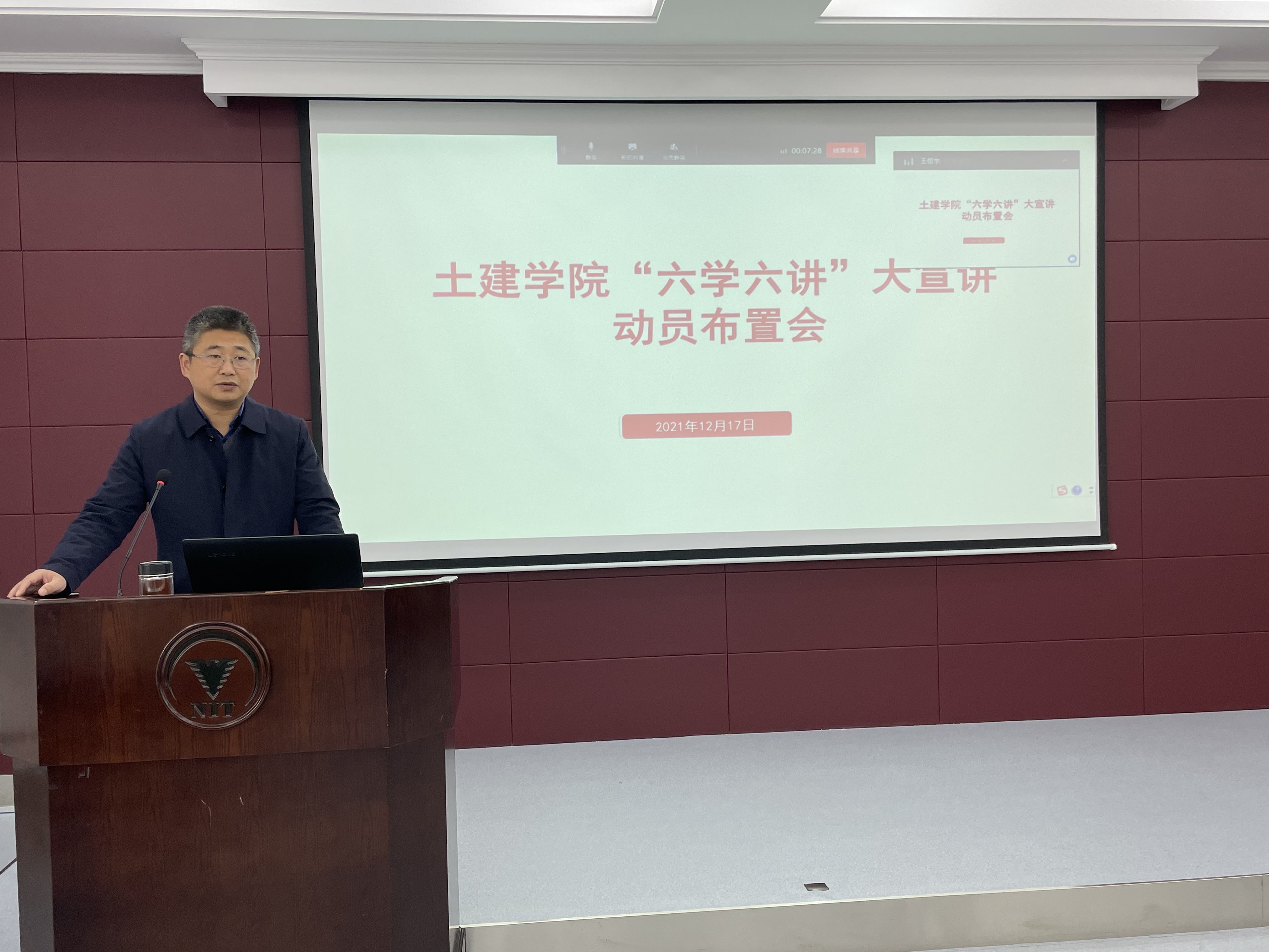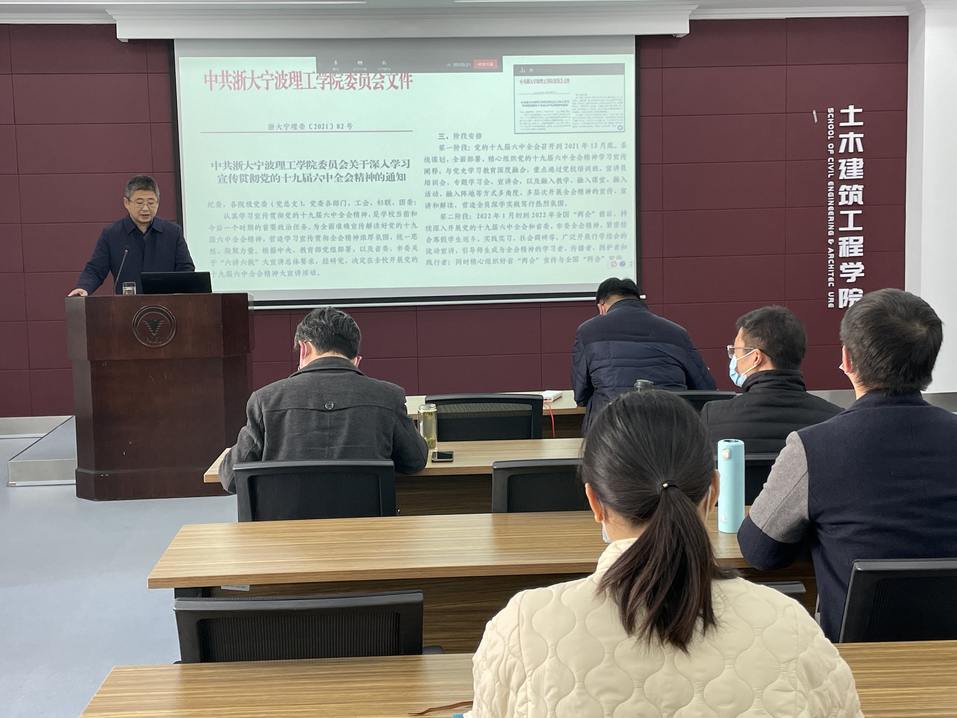 根据《中共浙大宁波理工学院委员会关于深入学习宣传贯彻党的十九届六中全会精神的通知》要求,12月17日下午,土建学院在SA305会议室召开了“六学六讲”大宣讲动员布置会。学院全体教师通过线上线下结合的形式参加了会议。