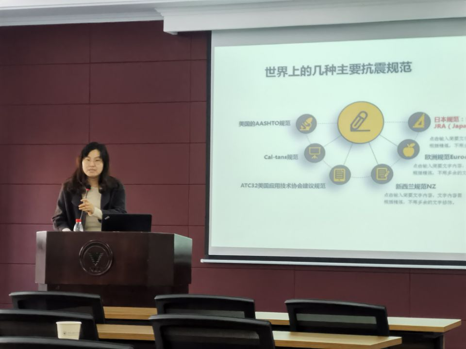 学院苏丹娜博士以“桥梁抗震方法设计图鉴”为题作学术交流报告。苏老师通过报告列举了世界上的几种主要抗震规范,重点介绍了日本抗震设计规范及工程抗震设计方法,详细讲解了动力时程分析法和防落梁系统以及车桥耦合作用对桥梁抗震设计的重要性。