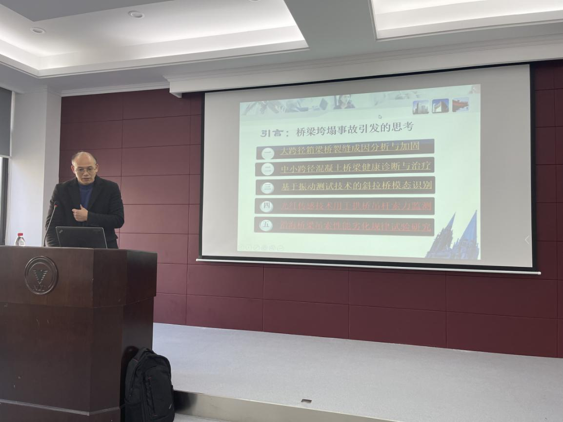 会上,智能防灾减灾工程研究所所长彭卫教授以“桥梁结构健康检测与性能退化预测”为题作学术交流报告。彭卫教授以世界范围内典型桥梁垮塌事故引起的思考作为引言,详细介绍了科研团队在大跨径箱梁桥裂缝成因分析与加固、基于振动测试技术的斜拉桥模态识别、沿海桥梁吊索性能劣化规律试验研究等方面的研究方法和研究成果。