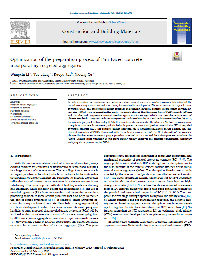 2月25日,学院2019级土木工程专业本科生李王鑫以第一作者在权威期刊Construction and Building Materials上发表了题为Optimization of the Preparation Process of Fair-Faced Concrete Incorporating Recycled Aggregates的学术论文。该期刊为JCR一区期刊,影响因子6.141。我院学生李王鑫为第一作者,学校为第一单位,徐亦冬教授为通讯作者,London South Bank University金若愚教授(学院国际合作基地兼职教授)为论文作者之一。此次为学院本科生首次在SCI一区发表学术论文。