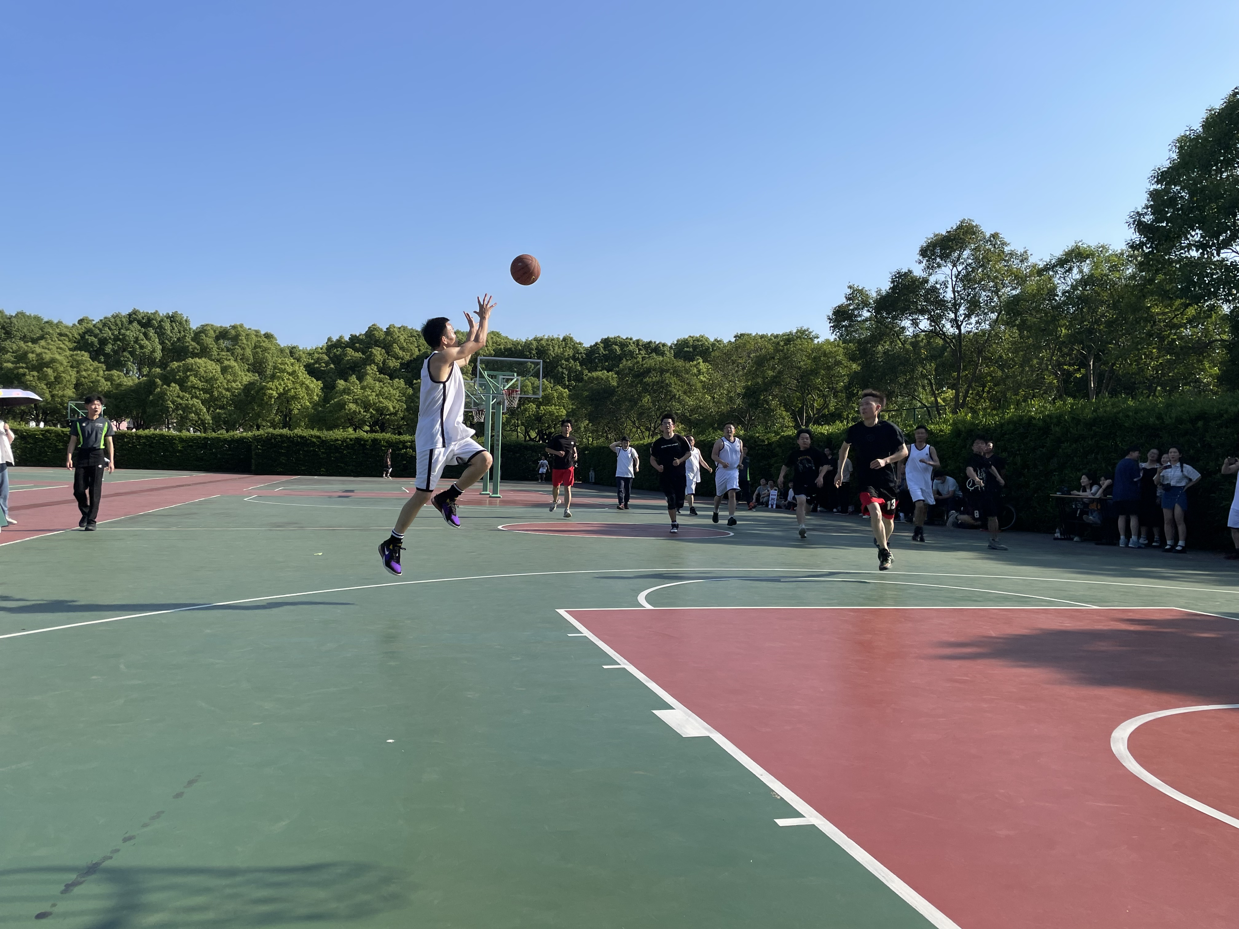 联谊赛第二场比赛由院教工篮球队对阵研究生篮球队,比赛在5月5日下午进行。经过第一场比赛的历练,参加比赛的老师们经验更加丰富,跳投、抢断、防守,配合也更加默契,展示了较高的竞技水平。而研究生们也斗志高昂,动作连贯,反应敏捷,毫不逊色。两队势均力敌,最终教工队以7分优势取得本场比赛的胜利。
