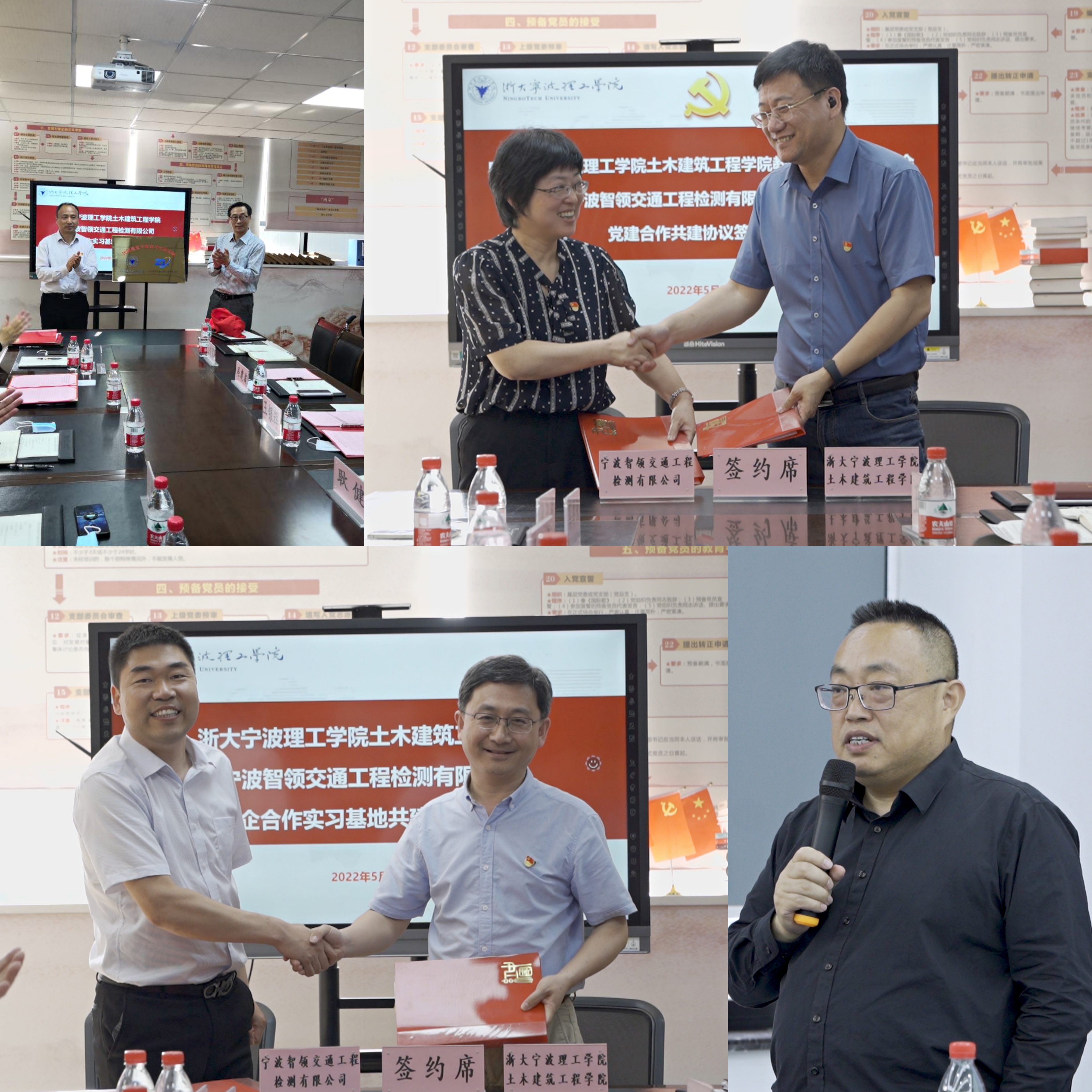 5月26日,中共浙大宁波理工学院土木建筑工程学院教工第三支部委员会与中共宁波交通工程建设集团有限公司智领交通工程检测有限公司支部委员会“砼”盟党建合作共建协议签订仪式在SA310隆重举行。学校党委副书记冯建波、宁波交通工程建设集团有限公司党委副书记、纪委书记马春龙、总工程师宋冰泉,土建学院副院长王文军、耿健等出席签订仪式。会议由学院党委书记王银辉主持。