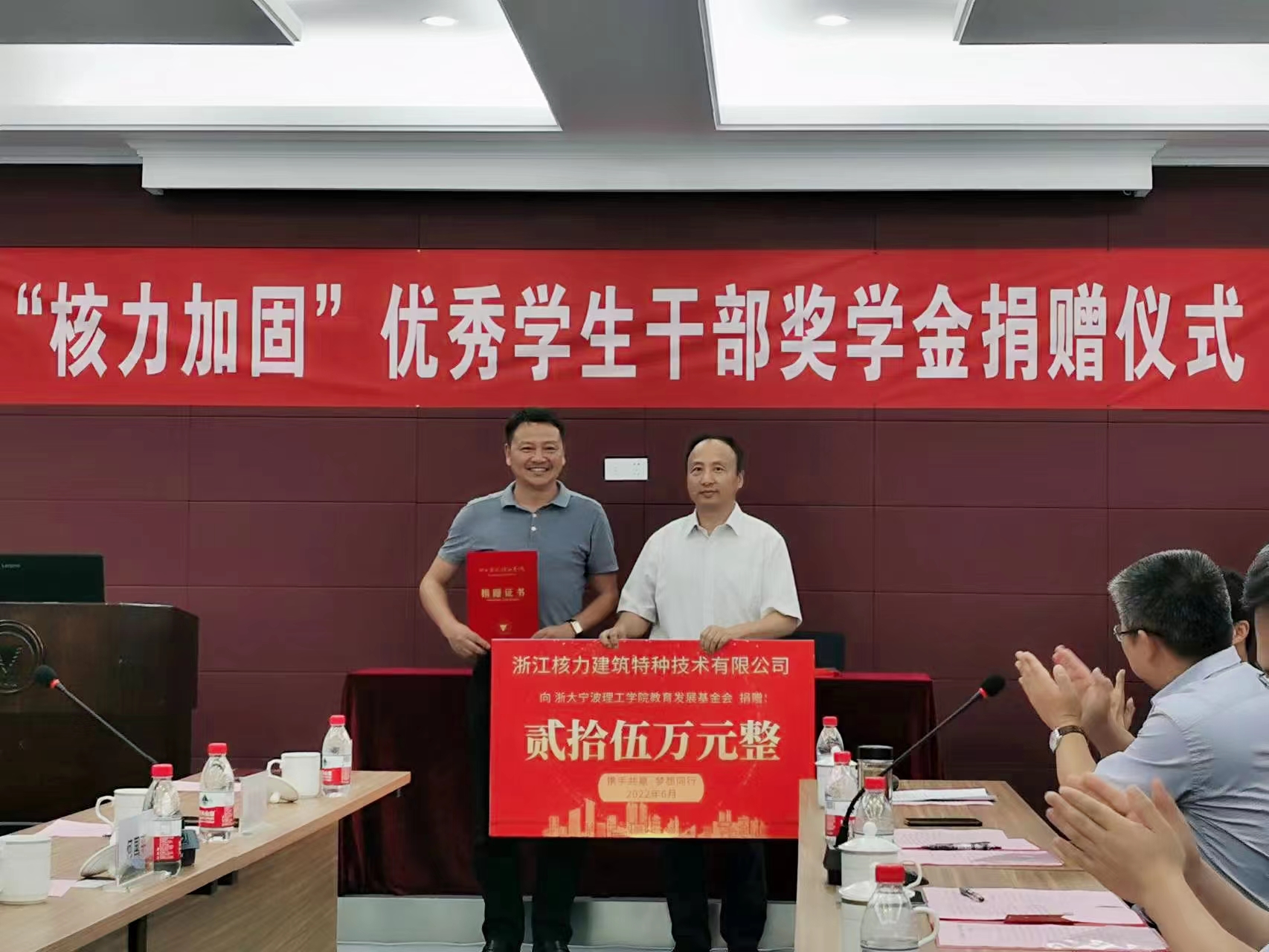 浙江核力建筑特种技术有限公司向学校教育发展基金会捐赠25万元,用于奖励土建学院品学兼优的学生干部。王银辉与杨军龙签订“核力加固”学生干部奖学金捐赠协议,冯建波副书记为金峰副总经理颁发捐赠证书。