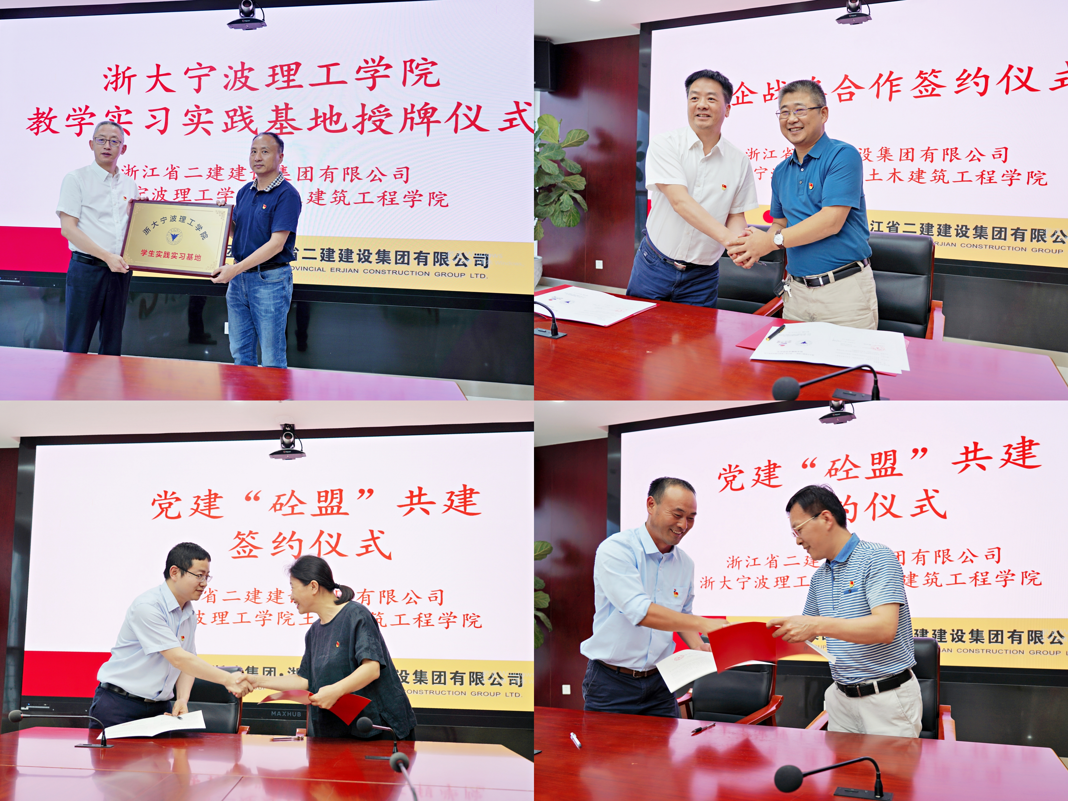 8月1日下午,浙大宁波理工学院党委副书记冯建波、土建学院党委书记王银辉一行走访了浙江省二建建设集团有限公司,校企战略合作协议、党建“砼盟”共建协议签约仪式在省二建大厦举行。省二建总经理、党委副书记卓建明,党委副书记、纪委书记陈旭辉,党委委员、总工程师周旭光,党委委员、总会计师庄培存等出席签约仪式。