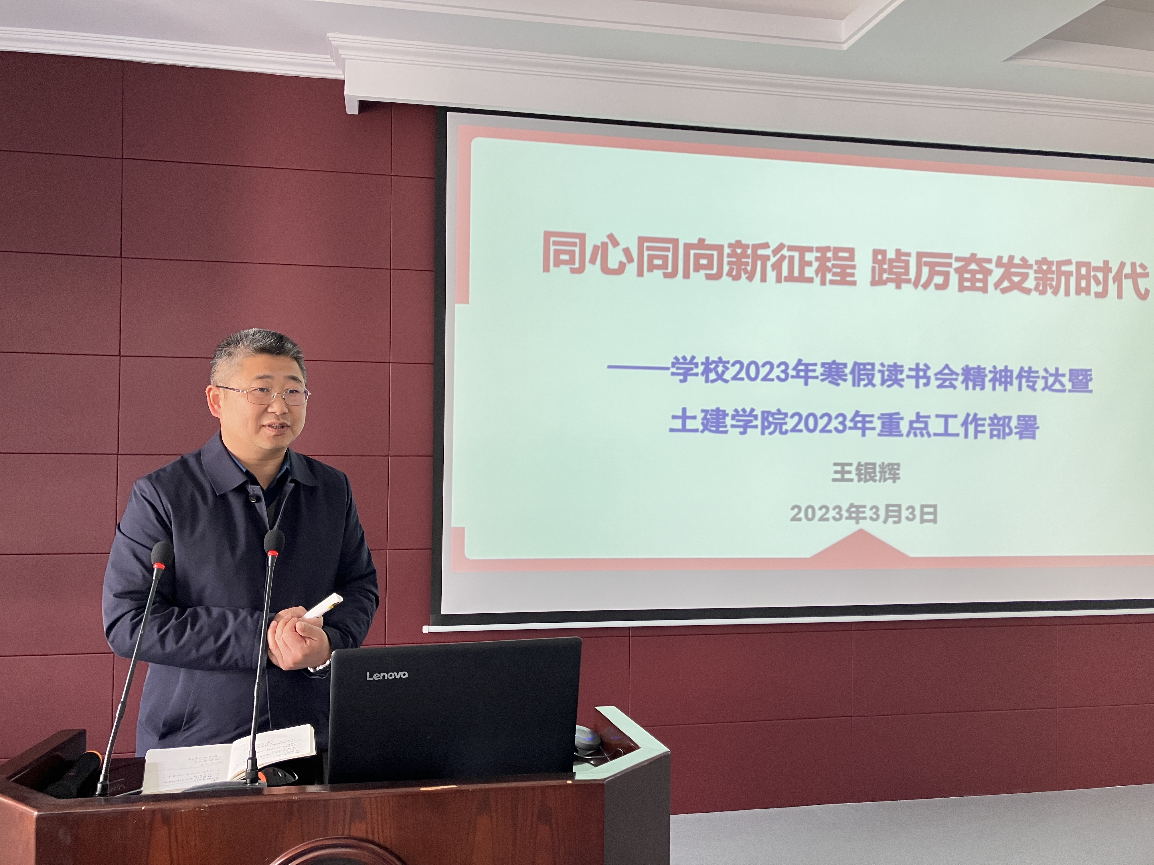 学院党委书记王银辉作《同心同向新征程 踔厉奋发新时代》主题报告。他传达学校2023年寒假读书会精神,布置2023年度重点工作,同时向全院教师公开了领导班子2022年度民主生活会召开情况。他强调,学院上下要凝聚共识、携手共进、补强短板、攻坚克难,高质量完成“十四五”发展规划中的年度目标。