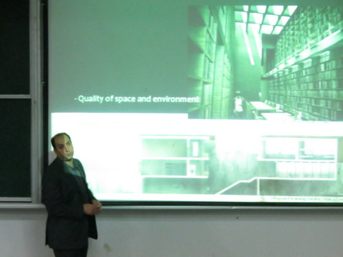 在交流会上,英国女王大学教授向同学们介绍了英国女王大学的历史背景、科学优势及校园建设等情况。Gamal教授更是通过剖析某位学生的图书馆设计作品,向同学们展示了他们一贯坚持的Technology、Performance、Industry设计理念,引发了在场同学的极大兴趣和深入思考。交流会上,往届赴英国女王大学留学的学长更是通过视频向同学们展示了他们在英国女王大学学习生活情况,鼓励学弟学妹出国深造、拓展见识、加强实践。