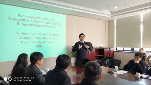 2018年12月29日上午10:00,来自美国堪萨斯大学的韩杰教授在土建学院SA306会议室举行了一场题为“土工合成材料加筋桩承式路堤研究的新进展”学术报告会,土建学院老师、研究生和本科生等50多人聆听了这场高水平的报告会。