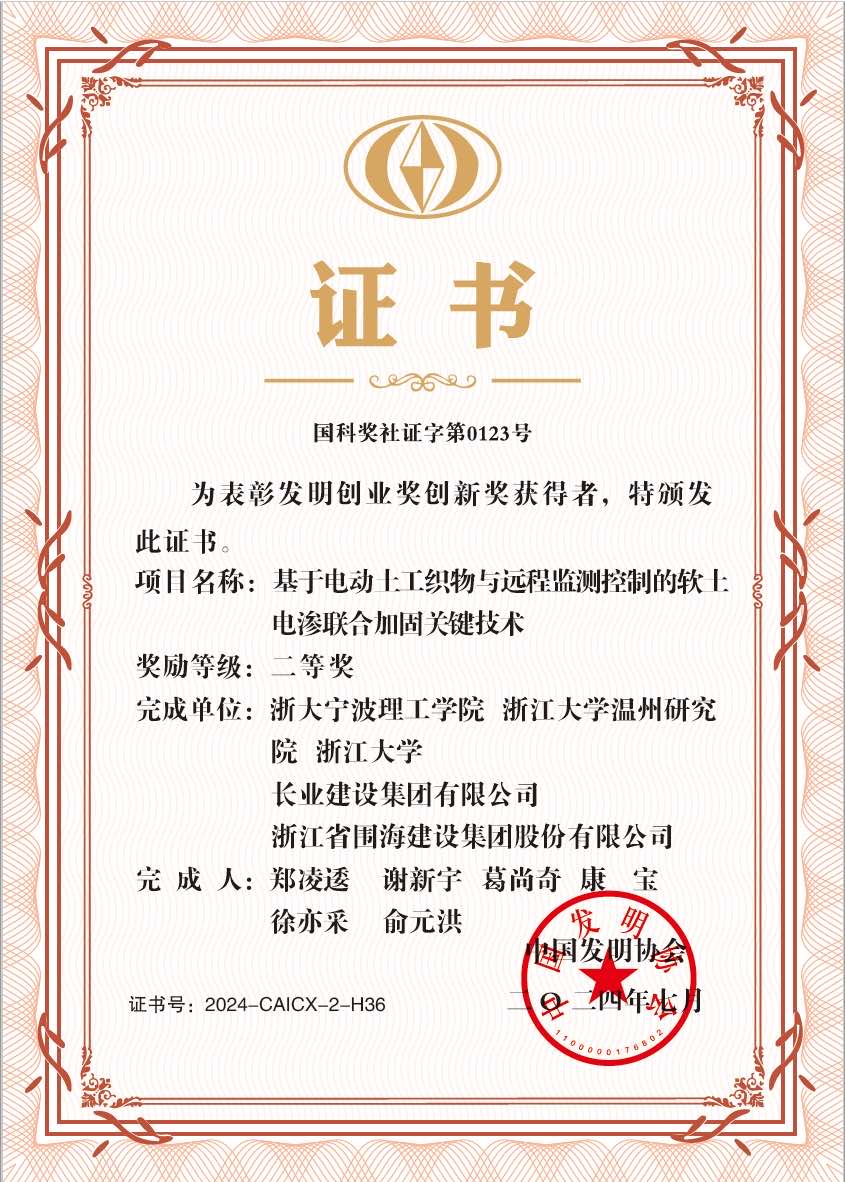近日,中国发明协会颁发了2024年度发明创业奖证书,我校作为第一完成单位、土建学院郑凌逶博士作为第一完成人的“基于电动土工织物与远程监测控制的软土电渗联合加固关键技术”成果获得发明创业奖创新奖二等奖!