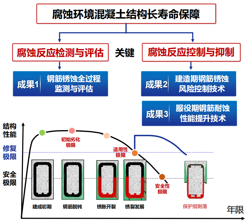 该成果在混凝土结构钢筋锈蚀行为监测、建造期钢筋锈蚀风险控制、服役期钢筋耐蚀性能提升等方面取得突破,形成了系列自主知识产权、标准规范和成套技术与装置。项目成果经评价,整体达到国际领先水平,已在交通工程、市政工程、房建工程等多个领域实现规模化应用,取得显著社会经济效益。