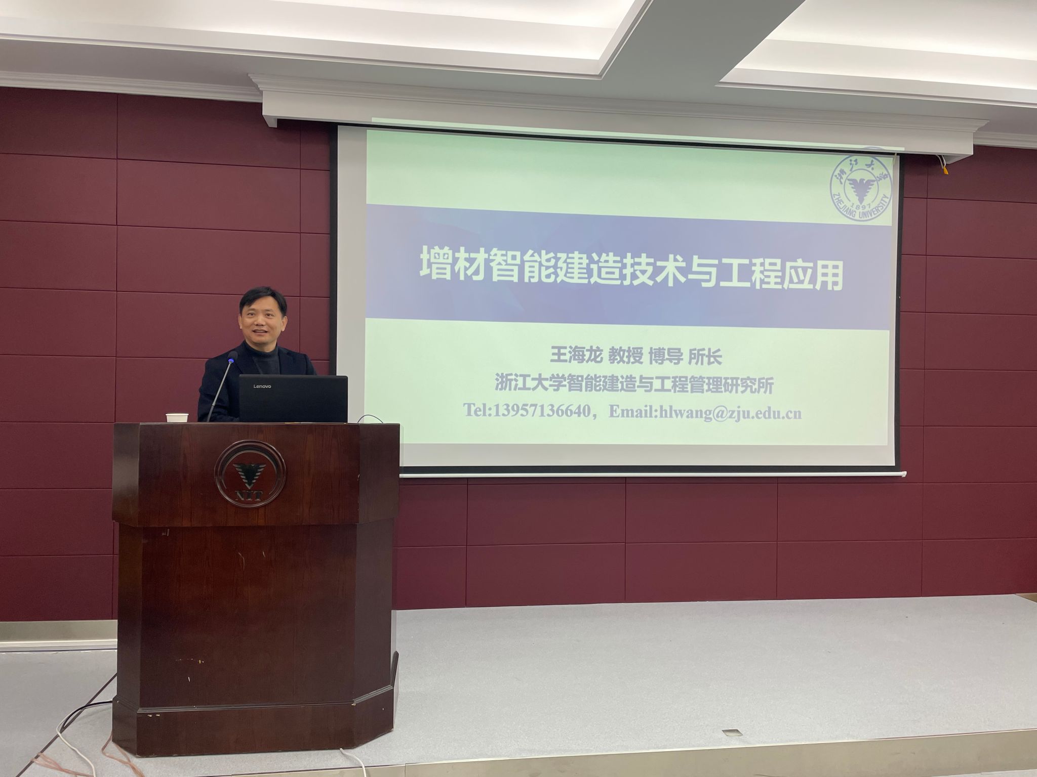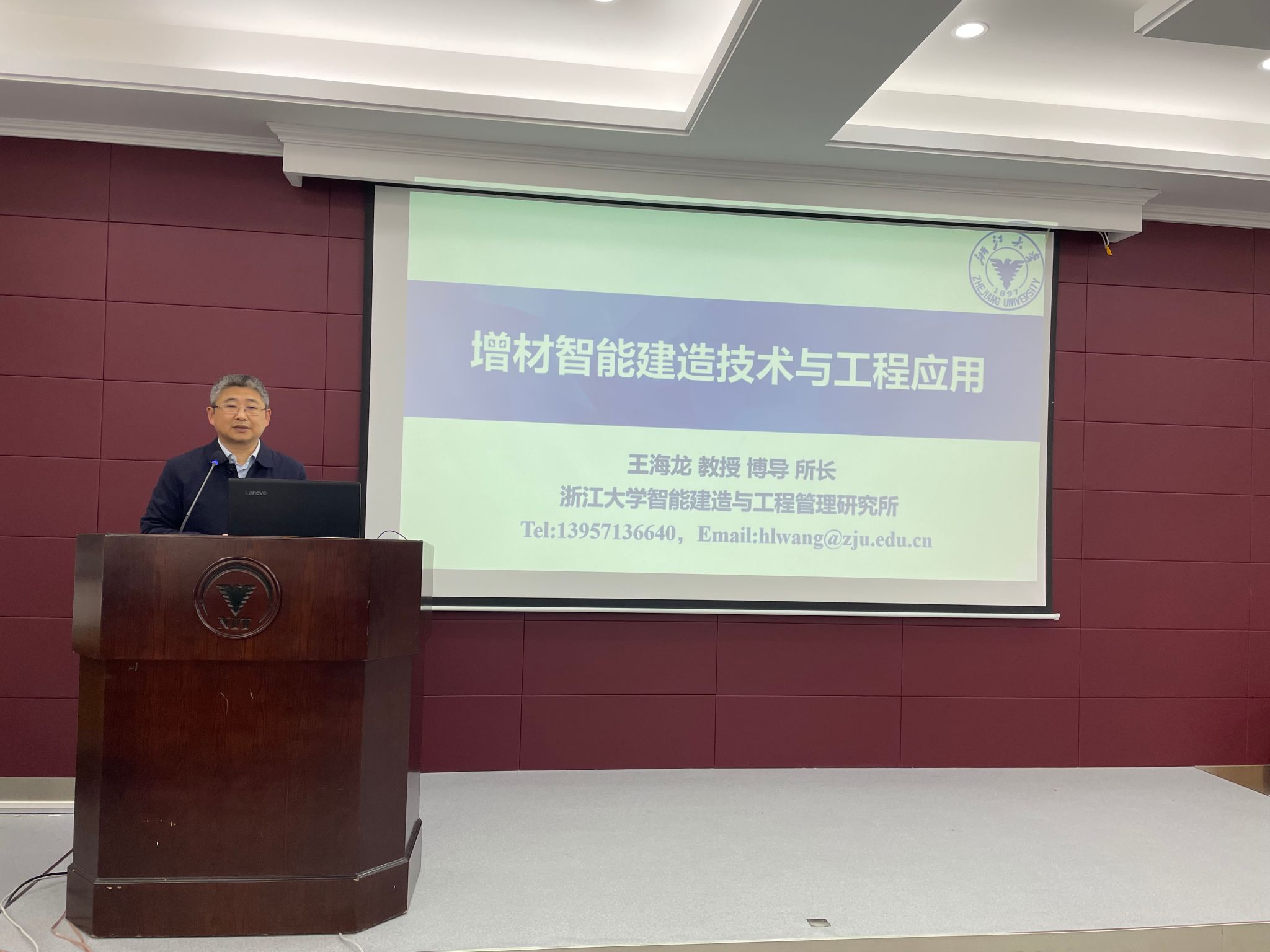 实地考察结束后,与会代表在土建学院参加“砼行论坛”学术报告,并进行了深入的技术交流。本次学术报告主题为“增材智能建造技术及其工程应用”,由浙江大学王海龙教授主讲,土建学院院长王银辉主持。