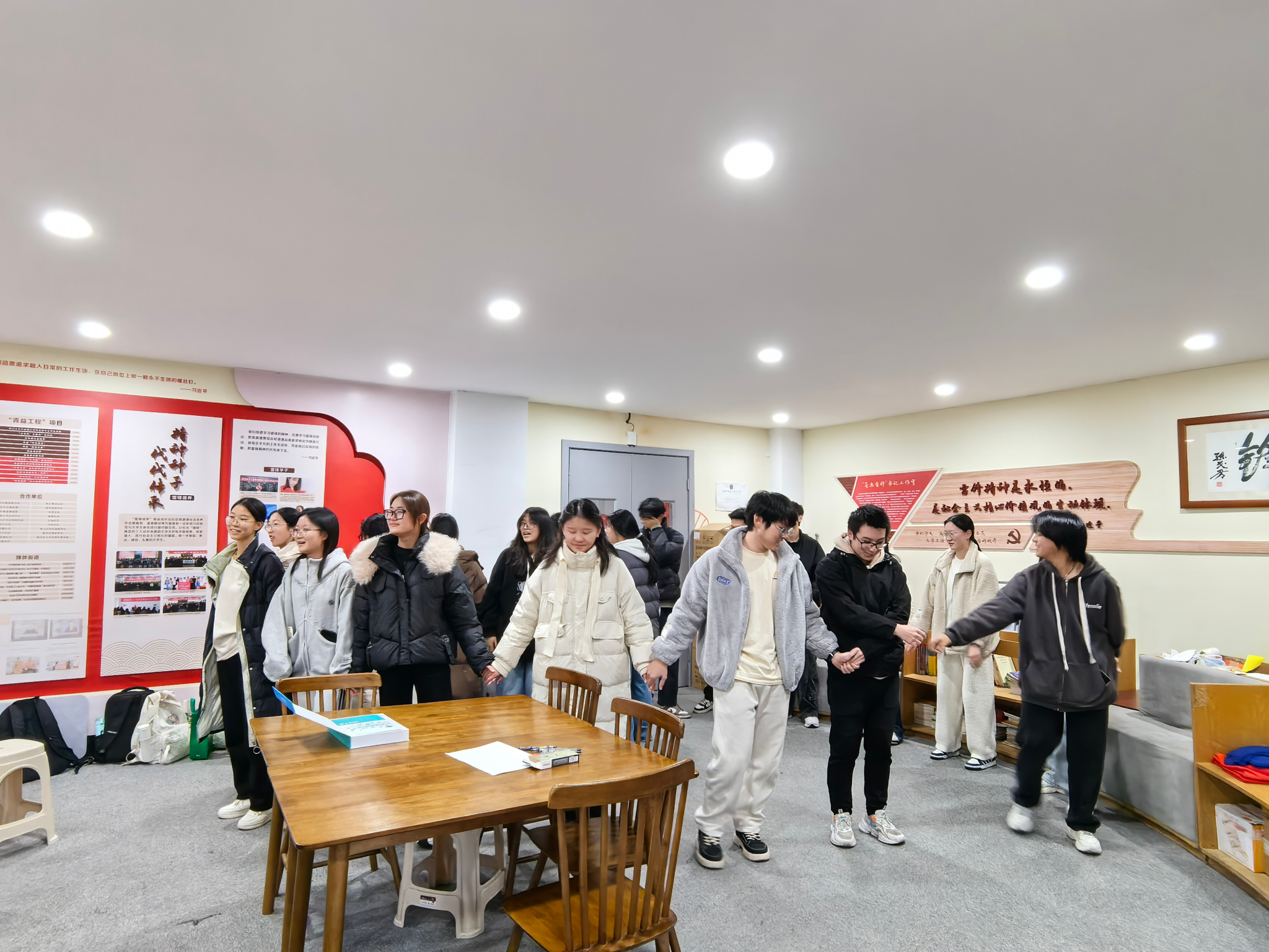 活动伊始,“心有千千结” 游戏率先点燃现场氛围。同学们随机围成圆圈,双手与身边伙伴交叉相握,形成错综复杂的 “人际心结”。大家在不松开手的前提下,通过默契配合、灵活转身、耐心调整,一步步解开缠绕的“结”,最终重新围成完整圆圈。过程中,欢声笑语不断,同学们在协作解谜中快速打破陌生感,拉近彼此距离,也深刻体会到沟通与协作的重要性,为后续活动的顺利开展奠定了良好基础。