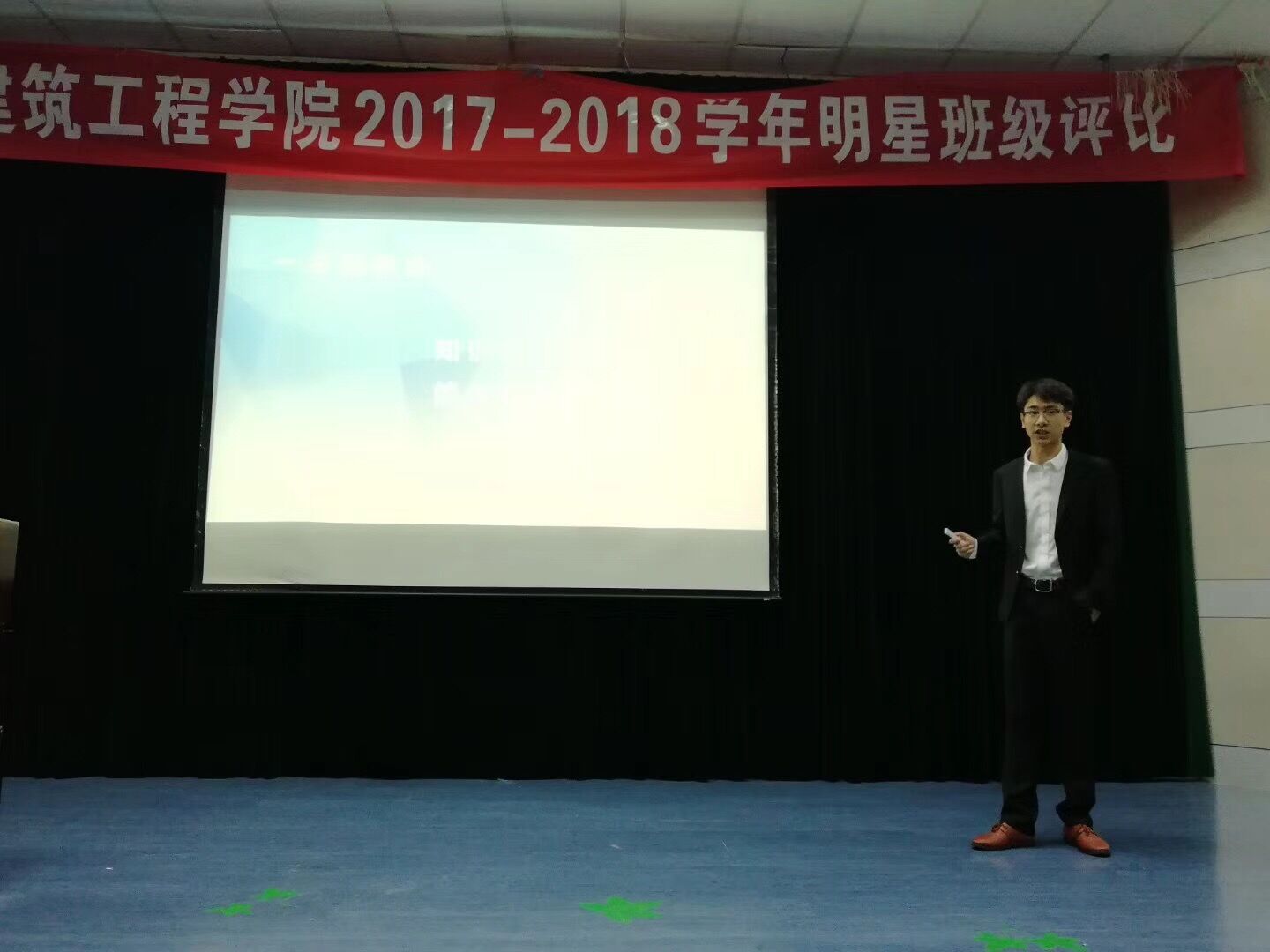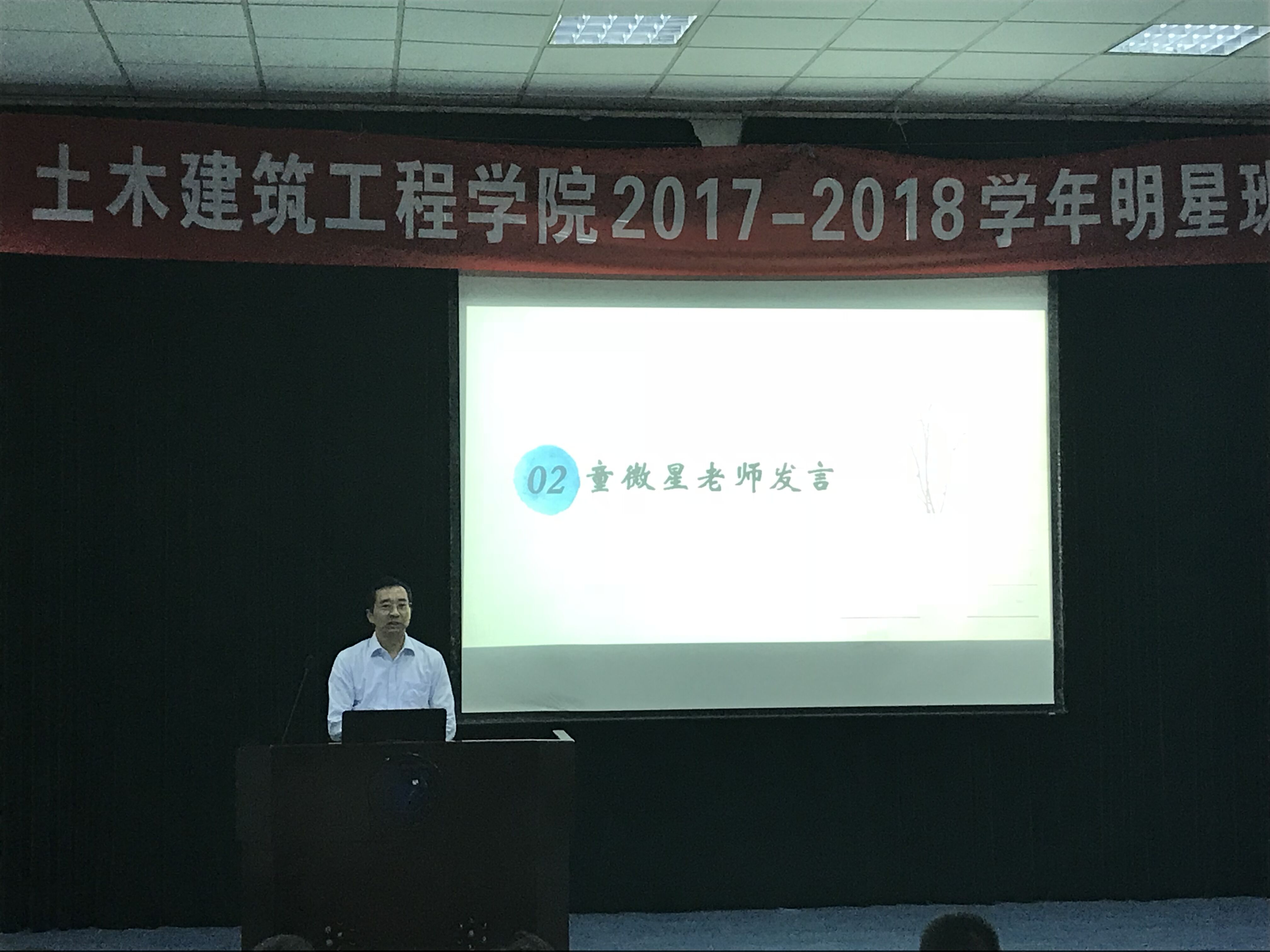 2018年5月6日晚6时30分,土建学院2017-2018学年明星班级评比活动于NF103举行,出席本次活动的有学院党总支书记童微星,思政主管周丽娟,院团委副书记曲昊杨,道桥161班班导师王韬以及土建学院团学组织学生干部代表。