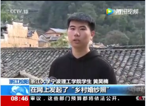 3月11日,在中央电视台的《朝闻天下》节目中,我院15级道桥专业的黄浩楠同学因乡村婚纱照片活动受央视点赞。新闻播出后,全院师生纷纷赞扬黄同学的公益行为,并将新闻转发至自己的社交平台宣传同学的公益活动。