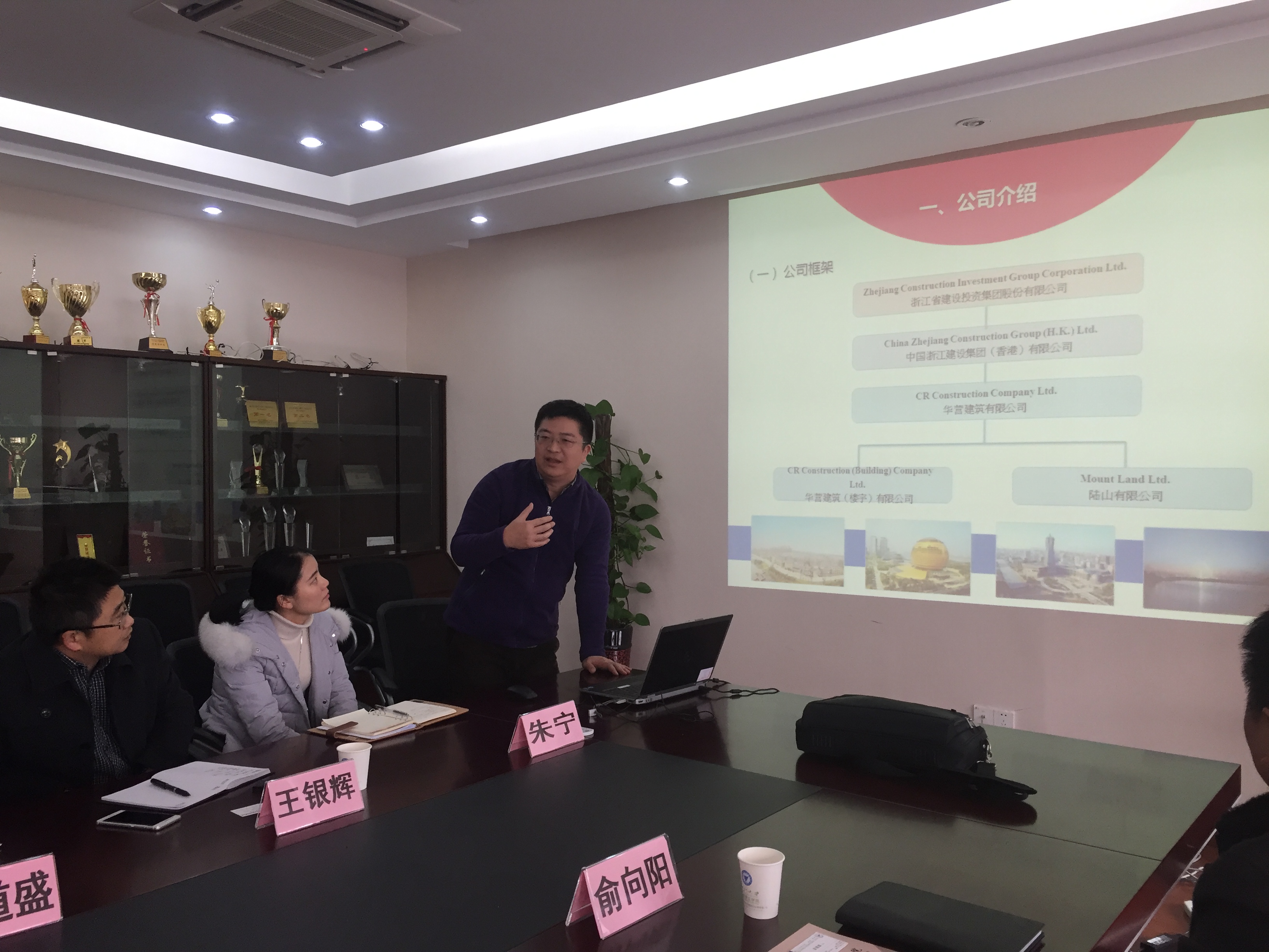 首先,凌道盛院长代表学院致欢迎词,副院长王银辉老师介绍学院基本概况。之后浙江省建设投资集团海外部党委书记张明智介绍了集团海外部情况以及在北非、香港、新加坡、日本、尼日利亚等地区分公司运营情况。接下来,中国浙江建设集团(香港)有限公司华营建筑有限公司董事长管满宇介绍分公司基本概况。之后,双方就专业设置、学科建设、学生培养及就业等方面进行深入交流。海外部副总经理俞向阳表示,希望学校在人才培养过程中能加强英语、《施工安全》教学课程学习,施工型人才需外向型培养。海外部总经理助理、市场经营部经理胡程顺博士建议在全国“一带一路”的大背景下,人才培养可向海洋工程、港口建设等方向发展,在校大学生应加强外语学习,企业更多需要复合管理型人才。李立新老师首先介绍工程管理专业基本情况,并希望能在课题研究、公司培训、合同管理等方面与集团建立长期合作。王银辉副院长建议在技术规范、合同管理、学生实习等方面深入细化校企合作。