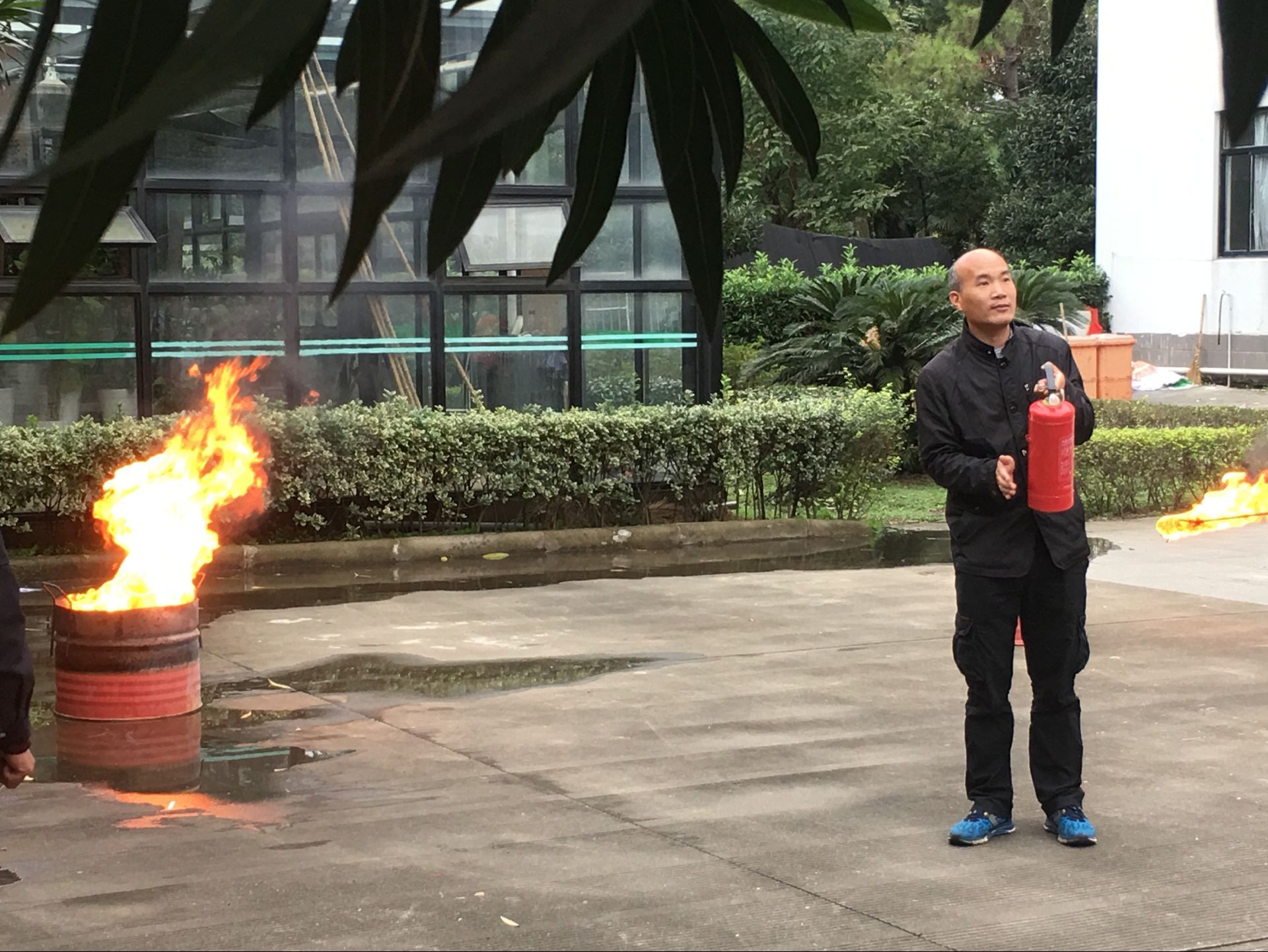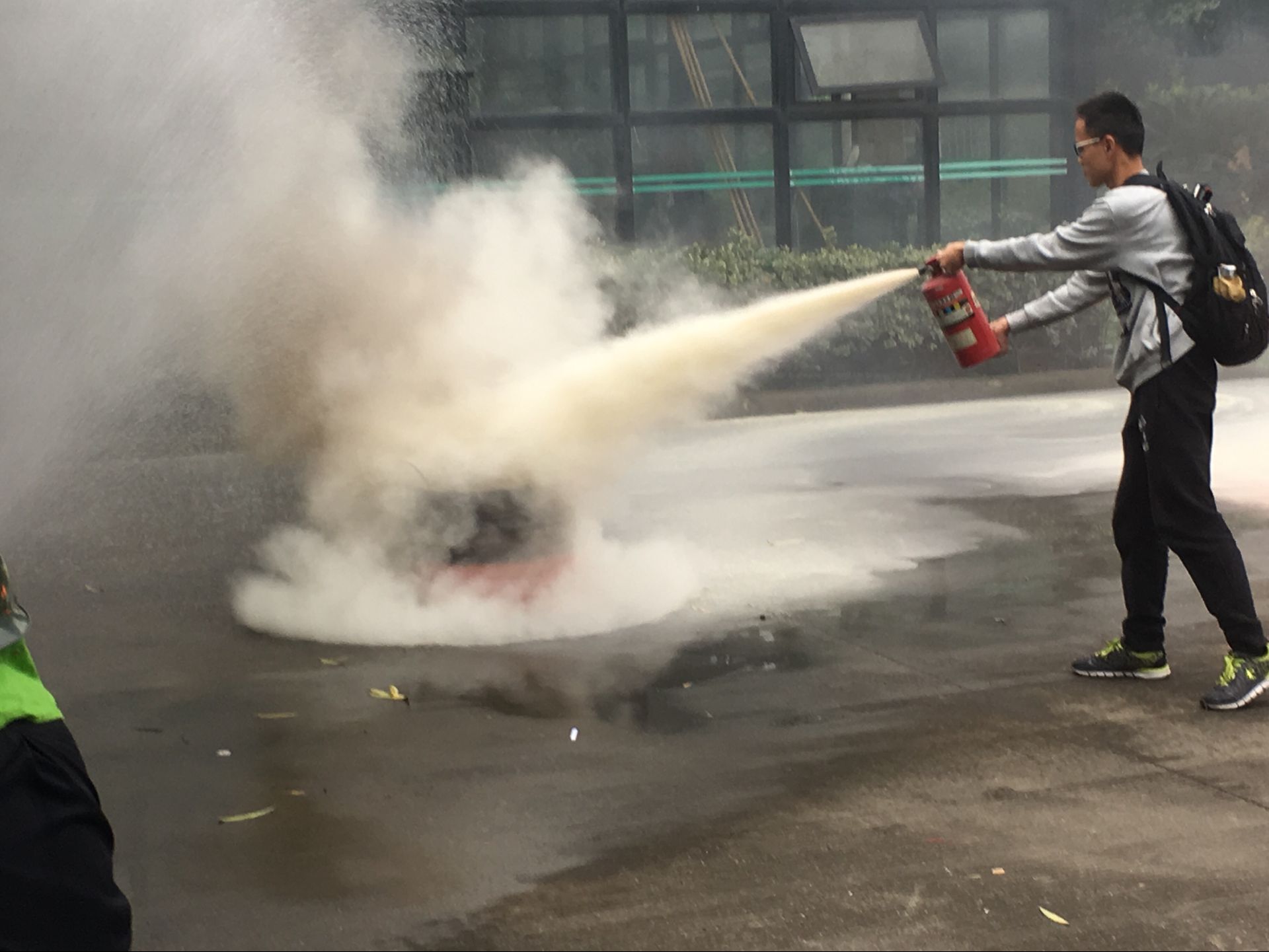 演习总指挥宣布演习开始,警报拉响,各位老师立即到达指定岗位,引导学生快速疏散,各实验室教师带领学生弯着腰,捂住口鼻,沿着指定楼梯口快速撤离到安全地带。接下来,保卫处叶卫树老师为大家介绍了灭火器的使用并做了示范,之后同学们逐一练习了如何使用灭火器灭火。最后童微星老师对本次演习做了点评。