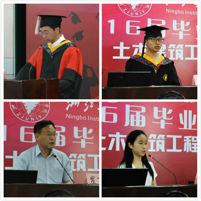 6月18日上午10:00,土木建筑工程学院于NF103举行2016届毕业生毕业典礼。出席此次典礼的领导嘉宾有浙江大学宁波理工学院党委副书记黄光杰老师、土建学院特聘教授凌道盛老师、党总支书记童微星老师、副院长兼党总支副书记王银辉老师、副院长张科锋老师,以及各研究所负责人、毕业班班导师等。典礼由党总支书记童微星老师主持。