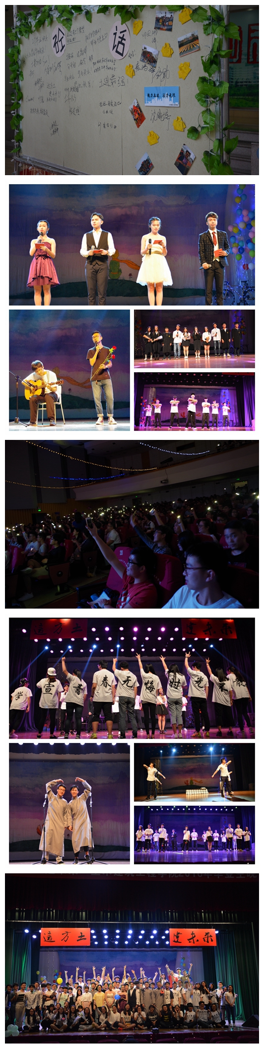 晚会激情在开场疯舞堂带来的舞蹈《draft》中瞬间点燃。团委同学趁热带来情景剧《与青春有关的日子》,再现了校园生活场景,表达了对母校的深深眷恋。伴着略微沙哑的歌声回忆突然汹涌,土建好声音冠军吴仑特和他的伙伴王伟栋带来歌曲《从前慢》,开始的开始,其实冥冥注定,曾经的曾经,原来藏着如此多的美丽,我们的我们,多远都会在一起。紧接着院社联的同学带来了相声,以幽默诙谐的风格展现了校园青春时光。院舞蹈队的《I can fly》用舞蹈表达了对毕业生的祝福:既然算不清多少成功失败,既然怀中还有烈酒,倒不妨就如此如蚕做茧,振翅翱翔,勇往直前。毕业生代表蒙晖深情演唱歌曲《她说》,学妹们纷纷上台献花。青协组织为我们献上自导自演令人捧腹大笑的小品《再回首》。之后学生会带来《你好,再见》歌曲串烧,首首歌曲扣人心弦,表达出“青春无悔,时光不散”的祝福。整场晚会还穿插着抽奖和游戏环节,台上台下互动和谐。抽奖过程中党总支书记童微星老师也激情献唱,为毕业生送上祝福。软件协会自制了《祝福》和《我只是害怕青春逝去》两个MV送给本次毕业生同学,虽然离别,土建永远是你们的家。晚会的最后,团学组织的同学们在可珍门口的红毯边排成两列,打开手机上的手电筒,随着骊歌轻轻挥手送别毕业生,这是我们给你们的最灿烂的星空,毕业快乐。