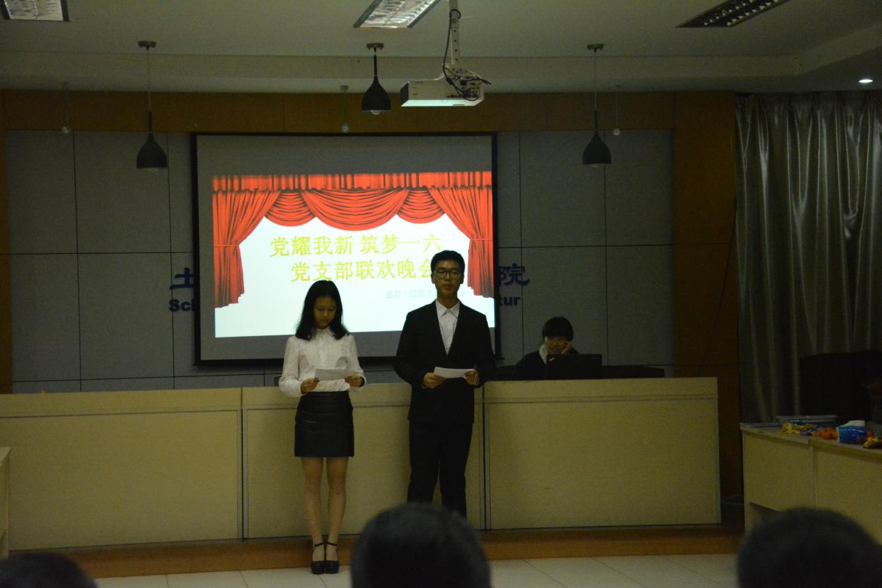 2015年12月28日晚,土木建筑工程学院红色先锋在SA301教室举办了以“党耀我新,筑梦一六”为主题的党支部联欢会,思政辅导员周丽娟老师、许琼波老师以及全体学生党员参加了本次活动。