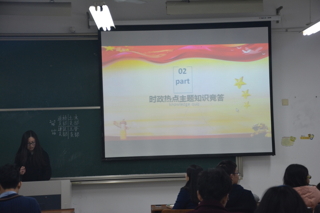 第二个部分是时政热点的问答及抢答环节。各支部对这一环节都表现出了热情,积极参与到题目的抢答之中,同时从答题的正确度也可以看出学生党员对当今社会的时事政治有着较高的了解程度。