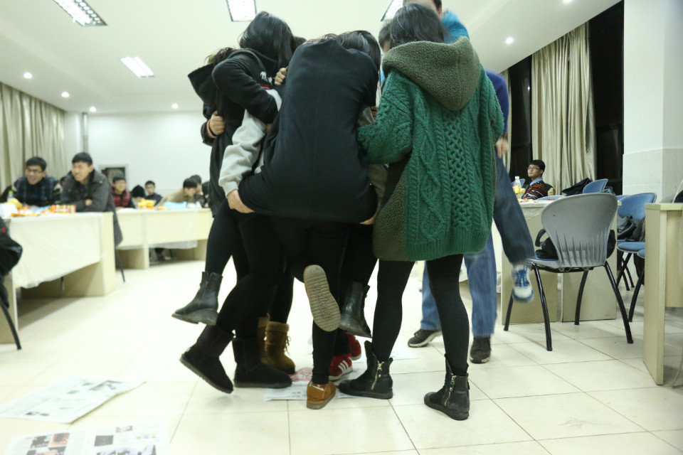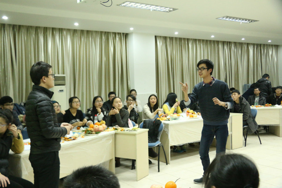 学生党员按签到顺序分组并入座后,主持人宣布活动正式开始。前三轮的游戏环节为第四轮的拼盘比赛做铺垫,赢得游戏的队伍可以获得更为丰富的水果。第一轮的问答环节瞬间点燃了活动现场的气氛,题目多为2014年的实事热点话题,为了能站在越变越小的报纸上,各组成员想尽办法,让活动现场充满了欢声笑语。第二轮的谁是卧底游戏则是掀起了活动的高潮,既有被首轮淘汰的卧底,也有取得最终胜利的卧底。而第三轮的猜各国领导人名字的游戏则让人感觉到了小小的为难。最后,第四轮限时20分钟的果蔬拼盘正式开始,每个小组都在热切地讨论并且摆出了有深切含义的样式。