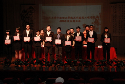 1月7日晚6点30分,土木建筑工程学院2012年度表彰大会于可珍讲堂隆重举行。三门建安有限公司副总经理杨世永先生、土建学院院长谢新宇老师、总支书记李萍萍老师、副院长张克明老师、孙家瑛老师、王银辉老师出席了表彰大会。