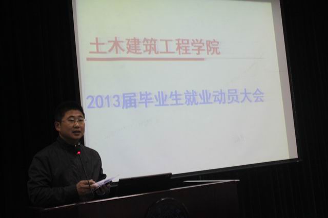 11月21日16:00,土木建筑工程学院在NF103召开2013届毕业生就业动员大会,帮助同学提高对就业的认识,分清本学期工作的重点,解答同学们对学习和就业的疑惑。学院党总支书记李萍萍、学院副院长王银辉、辅导员周春晓和2013届毕业生340余人参加了动员大会。