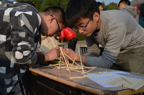 大赛分为两个环节,第一个环节为模型结构制作,每组选手以20双筷子和胶水作为原材料,需在三个小时内设计、制作完成模型结构。第二个环节为静压承重测试,参赛选手按照抽签编号依次进行,在测试装置上不断添加载荷,直至模型结构发生塑性形变,以此测试出结构最大承重,评选出最佳模型结构。