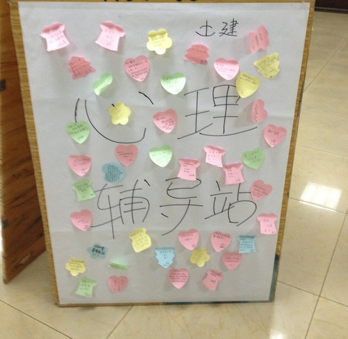在活动负责人姚天国老师的带领下,简单的分工之后,同学们变根据自己的任务分头忙碌了起来。标签的制作和收集等活动由大一新生负责,他们发挥自己的创造能力,将标签制作的有声有色。心理委员们精心布置黑板报,将同学生们事先写好的便签组成象征图形贴在板报上。每张便签都倾诉着同学们的心声,使得大家彼此增进了了解,有效促成了同学们关心互助,团结和谐的生活氛围,制作的展板也将在本周向全院师生展览。