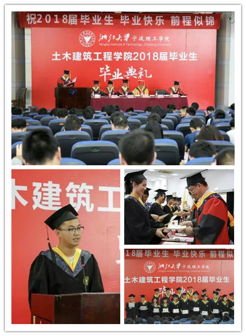 6月13日上午10:00,土木建筑工程学院在NF103举行2018届毕业生毕业典礼。出席典礼的领导嘉宾有浙江大学宁波理工学院党委副书记黄光杰老师、土建学院院长凌道盛老师、党总支书记童微星老师、副院长兼党总支副书记王银辉老师、副院长王文军老师、副院长张科锋老师,以及各研究所负责人、毕业班班导师、辅导员等。典礼由童微星老师主持。