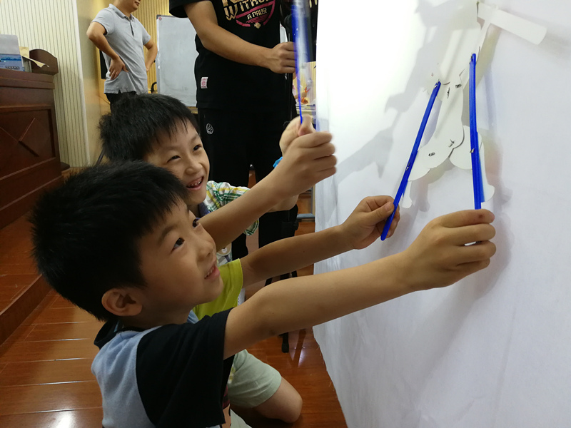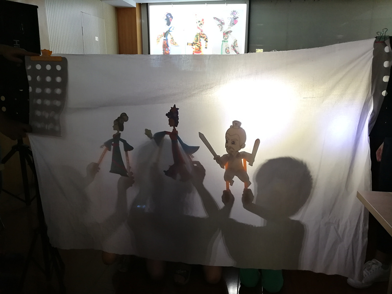 皮影制作完成后,小朋友们来到一方幕布后开始表演皮影戏,再经过志愿者们在幕后打灯,一场场戏栩栩如生的呈现在我们面前,由西游记师徒四人的故事,也有三国演技的兄弟情。“三尺生绡做戏台,全凭十指逞诙谐,有时明月灯窗下,一笑还从掌握来”,简单的舞台,灵巧的十指,加上一点光亮,小小的皮影就能演绎人生百态、历史沉浮。有谁可想得到从来只是读到的诗句,能够真实地展现在眼前呢?