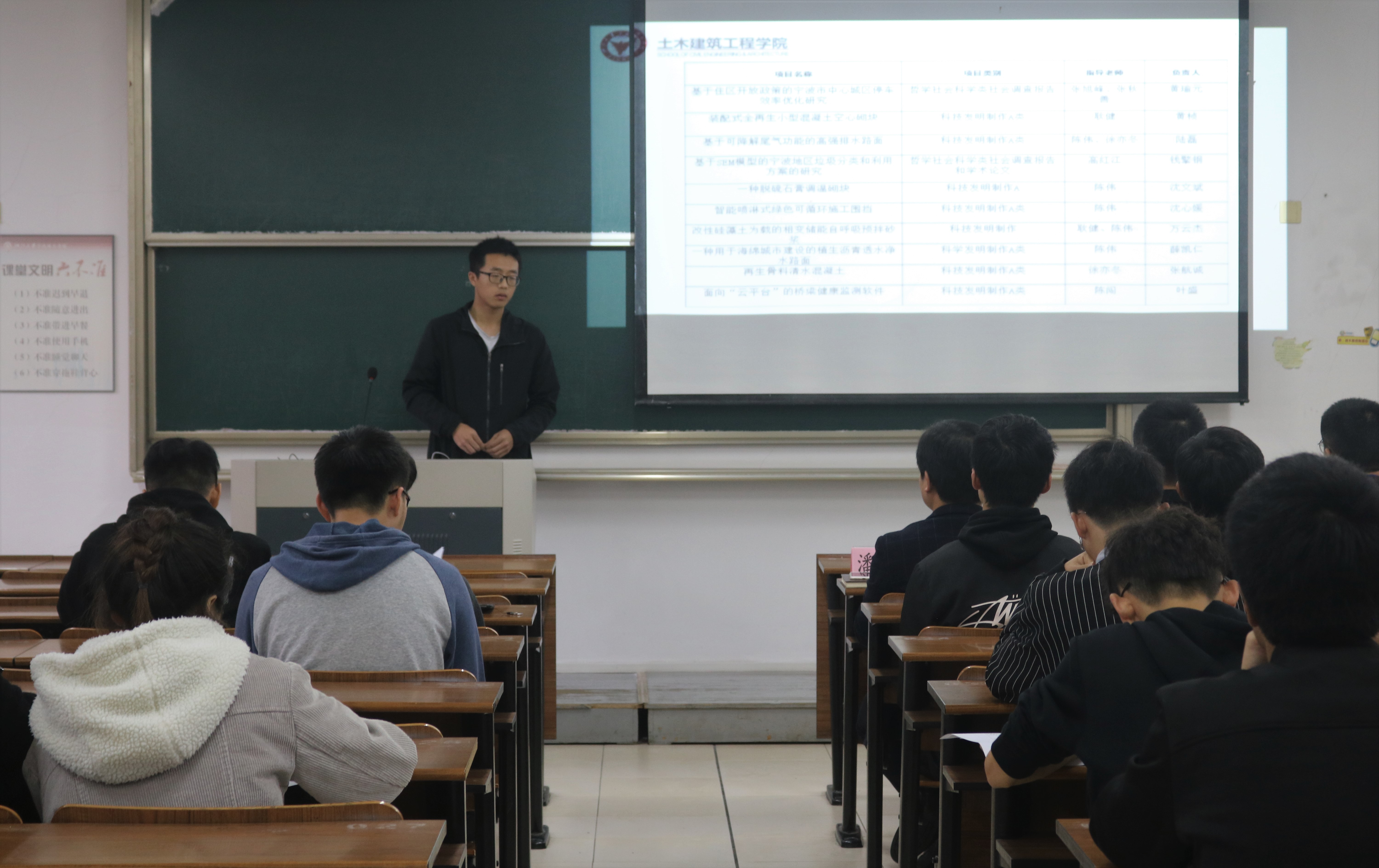 学校第六届“挑战杯”大学生课外学术科技作品竞赛即将开展,为了提高土建学院学生申报“挑战杯”项目的质量,学院组织研究所老师为这些项目“把脉”,提出切实可行的修改意见。作为学术活动,流程简单明了,直接开始。各组依次上台,进行三分钟的汇报,台下老师根据汇报内容以及各组的文字材料考量项目的创新性和可行性,随后进行答辩进一步了解项目内容。同学们充分利用专业优势,在相关领域发挥聪明才智。项目种类繁多,有发明创造类的新型施工围挡、桥梁健康检测软件等,也有社会调研类的停车位优化、垃圾分类研究等,现场氛围热烈,既是老师为学生解惑,也是对于学术领域的探讨。