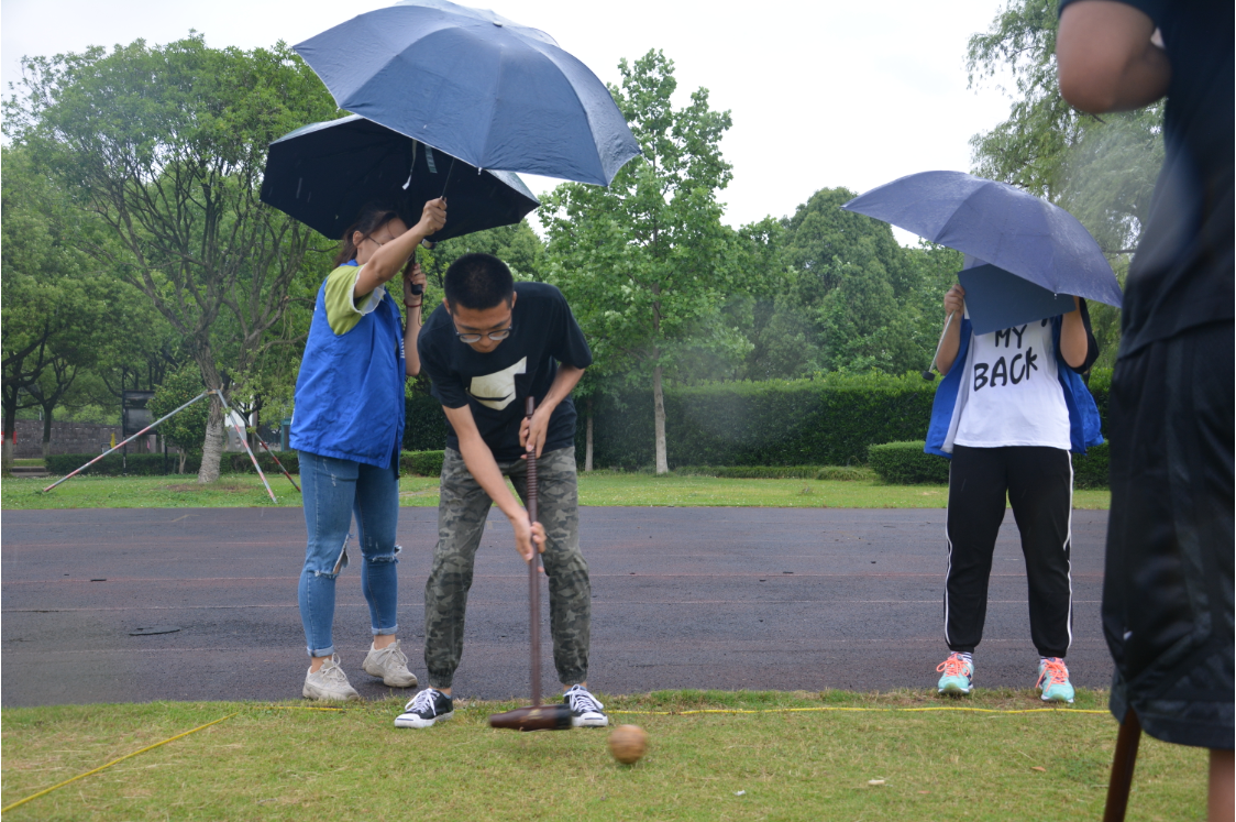 中午12点,女子组比赛开始,土建运动员一手拿球杆,一手拿木球,跟随志愿者裁判到达了指定场地。每一位运动员都充分地发挥了自己的实力。比赛进行到一半,突然下起了倾盆大雨,但运动员们丝毫没有退缩,依然坚持完成比赛,志愿者们在一旁帮忙举伞,为运动员们减轻风雨的磨难。在我们运动员们的不懈努力下,土建女子木球赛取得了两个个人奖和团体二等奖的好成绩。