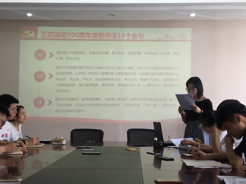 会上,首先在陈铠棋同志的介绍下,全体支部党员观看学习了习近平主席在“纪念五四运动100周年大会”上的讲话,着重学习了五四运动的伟大意义,即以全民族的力量高举起爱国主义的伟大旗帜,以全民族的搏击培育了永久奋斗的伟大传统,激发了追求真理、追求进步的伟大觉醒。随后陈铠棋同志就习近平主席对当代青年的“六点要求”进行介绍。土木工程学生党支部全体党员也参与阅读了习近平主席在大会上的金句。之后,陈铠棋同志介绍了“自我革命精神”,并且通过介绍引发全体党员对于自我反省的思考,思考周而复始工作下的态度;思考“吾日三省吾身”的态度;思考入党时的初心和态度等等。这个观点得到了在场党员同志的赞同和肯定。会议末尾,全体党员就黔西南贫困学子联系的问题进行讨论,一致同意采用书信往来的方式与结对学子进行联系,书信由党小组轮流负责。