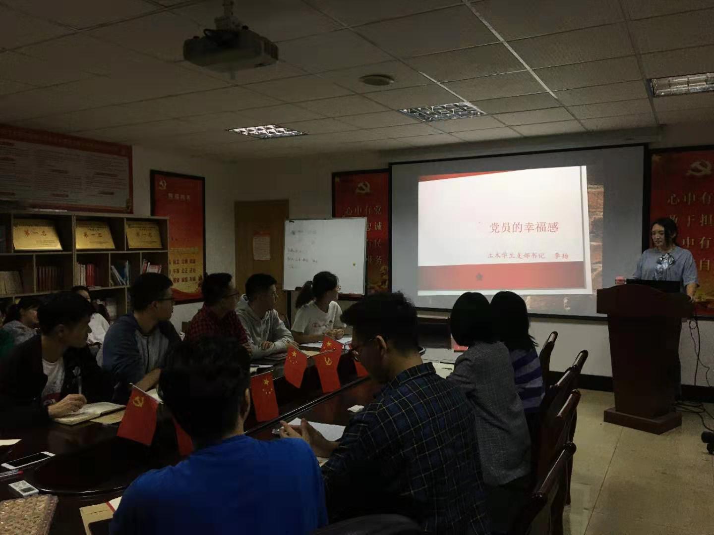 10月12日晚,土木学生党支部在党员之家开展了支部书记上党课主题教育,主题为“党员的幸福感”。在李扬老师的一步步引导下,结合11号晚上观影“我和我的祖国”的感受,让支部同志对党员身份有了不一样的认识,以及在今后的发展中作为党员同志如何在实现自我价值的同时充满幸福感有了不一样的高度理解。