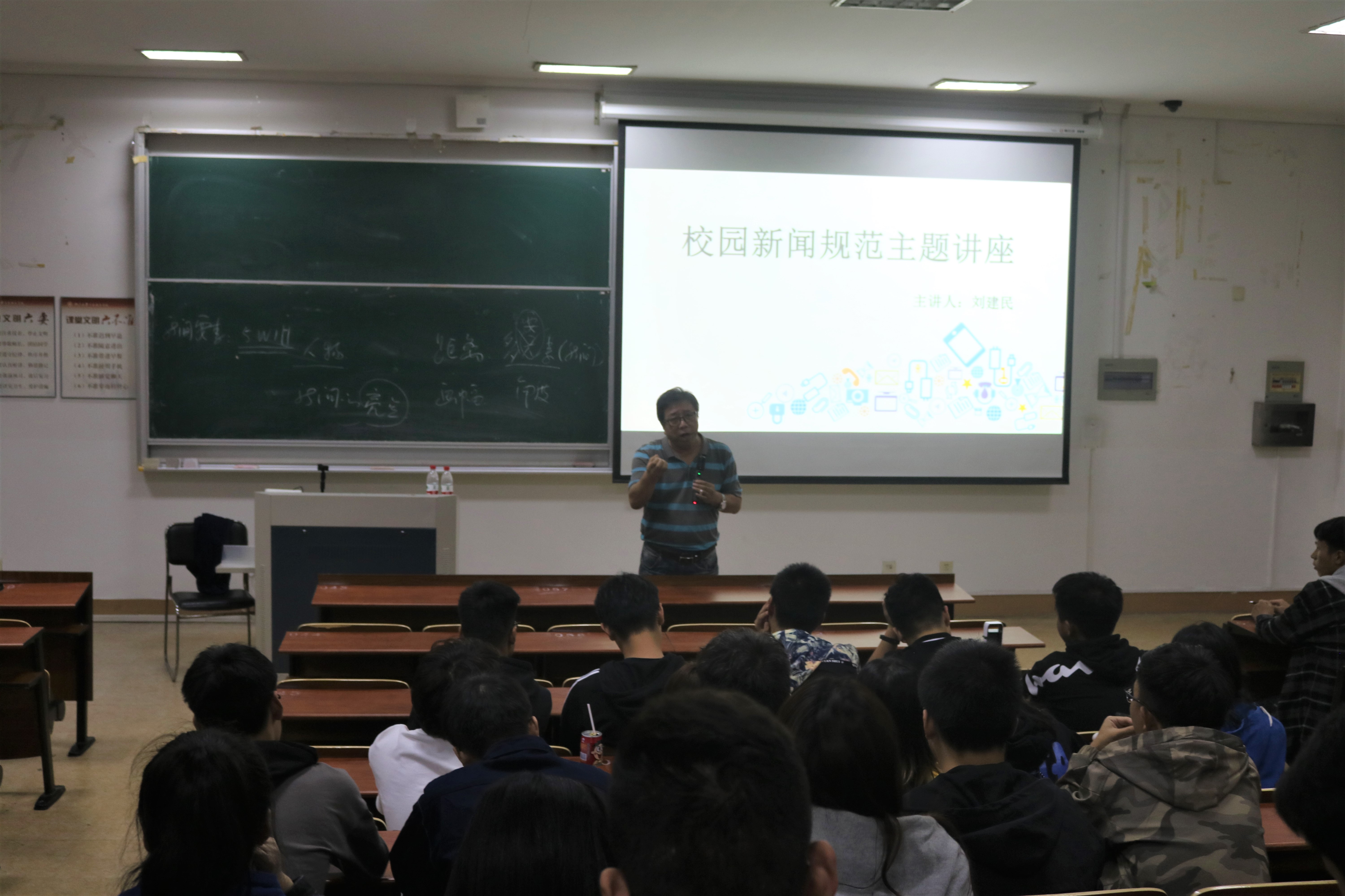 2019年10月15日,土建学院于SC103举办校园新闻规范的培训讲座,本次讲座特别邀请到传媒与设计学院刘建民教授,出席本次活动的有土建学院党委副书记韩晶晶老师,思政辅导员李扬、沈露以及来自各班级、各组织部门的同学。