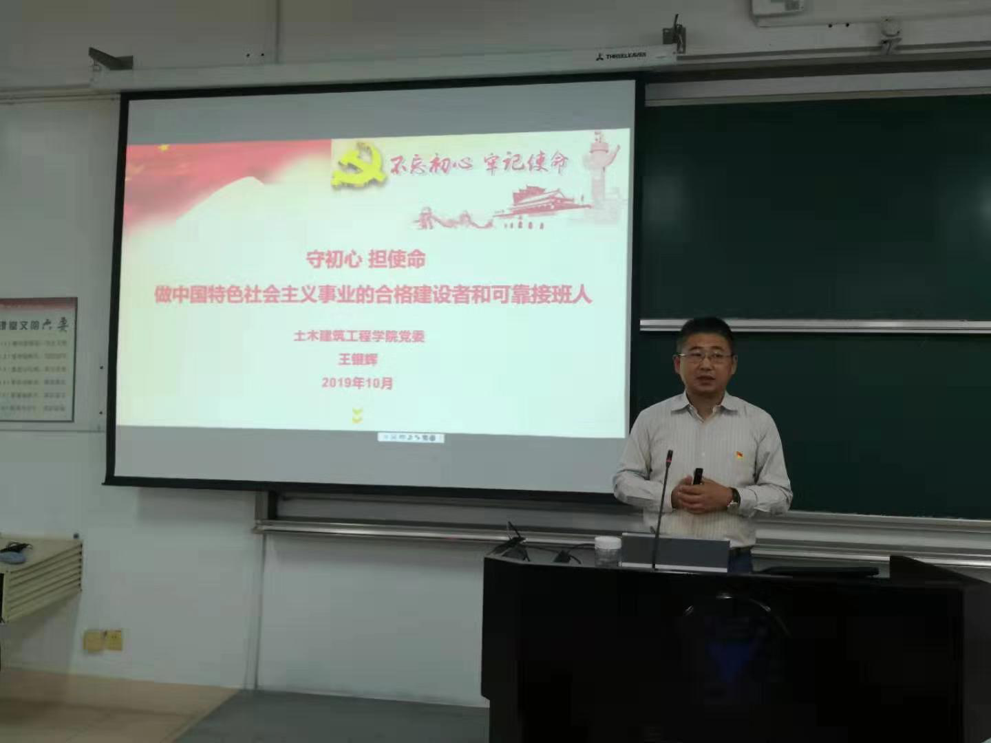 2019年10月18日,土木建筑工程学院“守初心、担使命,做中国特色社会主义事业的合格建设者和可靠接班人”主题教育开课,由土建学院党委书记兼副院长王银辉主讲,土建学院全体学生党员到场听讲。