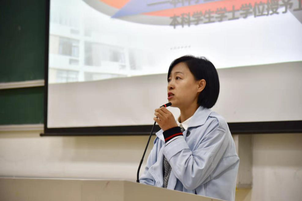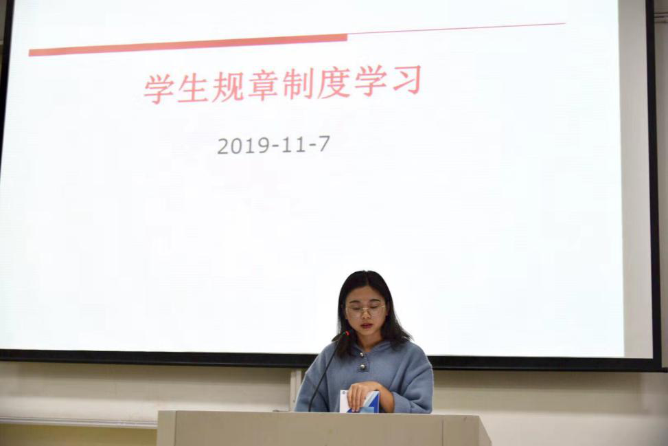 首先,教务办的刘冰老师为所有2019级新生进行教务培训,同时,她结合学生手册,围绕专业培养方案、本科学生选课管理、本科学生各项管理规定三大类开展介绍与培训,重点介绍了选课系统、《本科学生学籍管理规定》、优秀学生转浙大(立交桥政策)、学士学位授予工作实施细则。在讲解的过程中,刘冰老师反复强调了班长作为师生沟通纽带的重要性,并提出了五点提醒事项。她以“珍惜在校时光,有所得”作结,引起了各位同学的深思。随后,周星老师为同学们进行了学务培训,她介绍了学工办各位老师的工作情况,具体讲解了《本科生奖学金评定及管理方法》(包含个人、班级、寝室、十佳学生等)、《本科生违纪处分实施办法》等,加深了同学们对于评奖评优内容的了解,在鼓励大家积极进取的同时也为同学们拉起了警戒线。