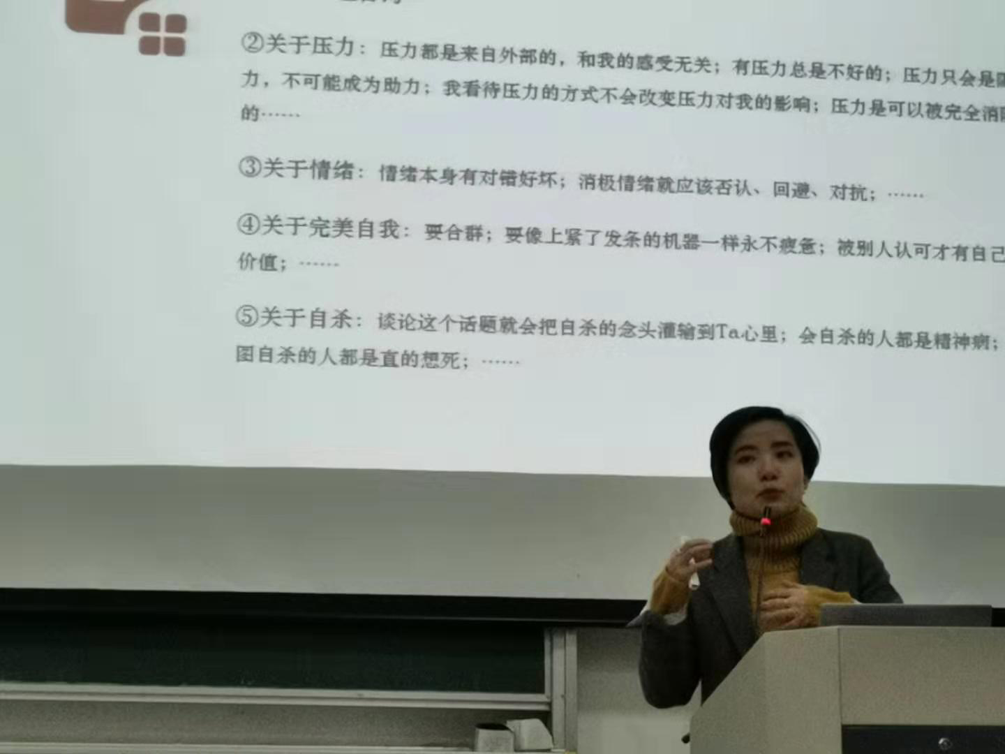 讲座的最后,李老师讲到本次心理讲座举办的意义:在当今大学生的心理问题日益显著的现在,引导同学们关注心理健康,正确地应对心理方面的困扰是非常有必要的。心理健康同身体健康是一样重要的,我们在身体生病的时候会及时的求助,在心理出现异常的状况时也同样应该积极地应对,寻求专业的人士的帮助。另外,也希望大家可以多多关注身边出现异常状况的同学,当发现有人学习下滑严重或者有旷课情况,或者情绪有异常等的时候,要及时反馈,帮助他们得到更好的心理援助。