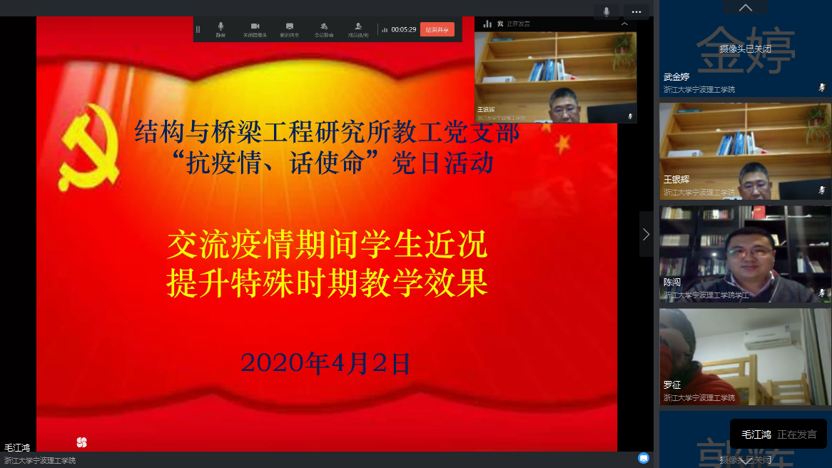 2020年4月2日晚上6点30分,结构与桥梁工程研究所教工党支部开展了“抗疫情,话使命”线上主题党日活动,支部全体党员及土木专业学生党员代表参加了此次活动。