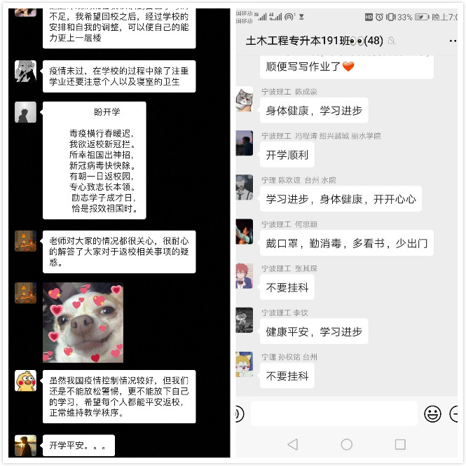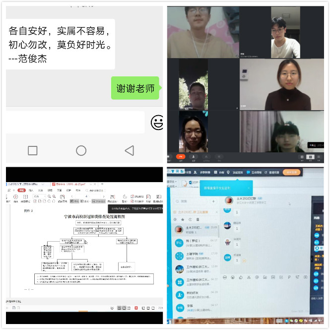各班同学在线上展开了深入地交流,班导师详细地介绍了返校注意事项等内容,了解了同学们上网课的情况反馈,对同学们表达了真挚的关心和问候,并介绍了疫情宅家期间自我调适的好方法,建议有需要的同学可以联系学校心理咨询中心进行线上咨询。